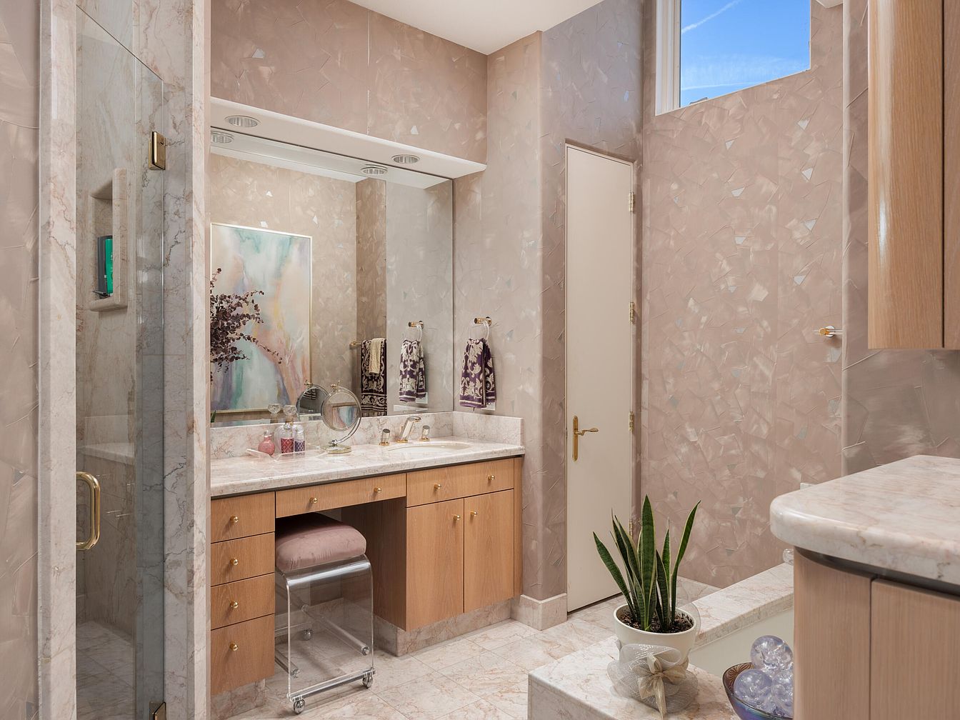 An elegant and spacious bathroom vanity area highlighted by a generous marble countertop and soft, muted tones. Light-colored wood cabinetry with gold hardware provides ample storage for family essentials, while a plush, rolling stool lends comfort and accessibility. Overhead recessed lighting and a large mirror enhance the brightness of the room, complemented by tall ceilings and a high window for natural light. Gorgeous abstract art and coordinated towels introduce subtle color, while a potted snake plant adds a touch of greenery. The space is both practical and serene, creating a family-friendly atmosphere with easy-to-clean surfaces and thoughtful design details.