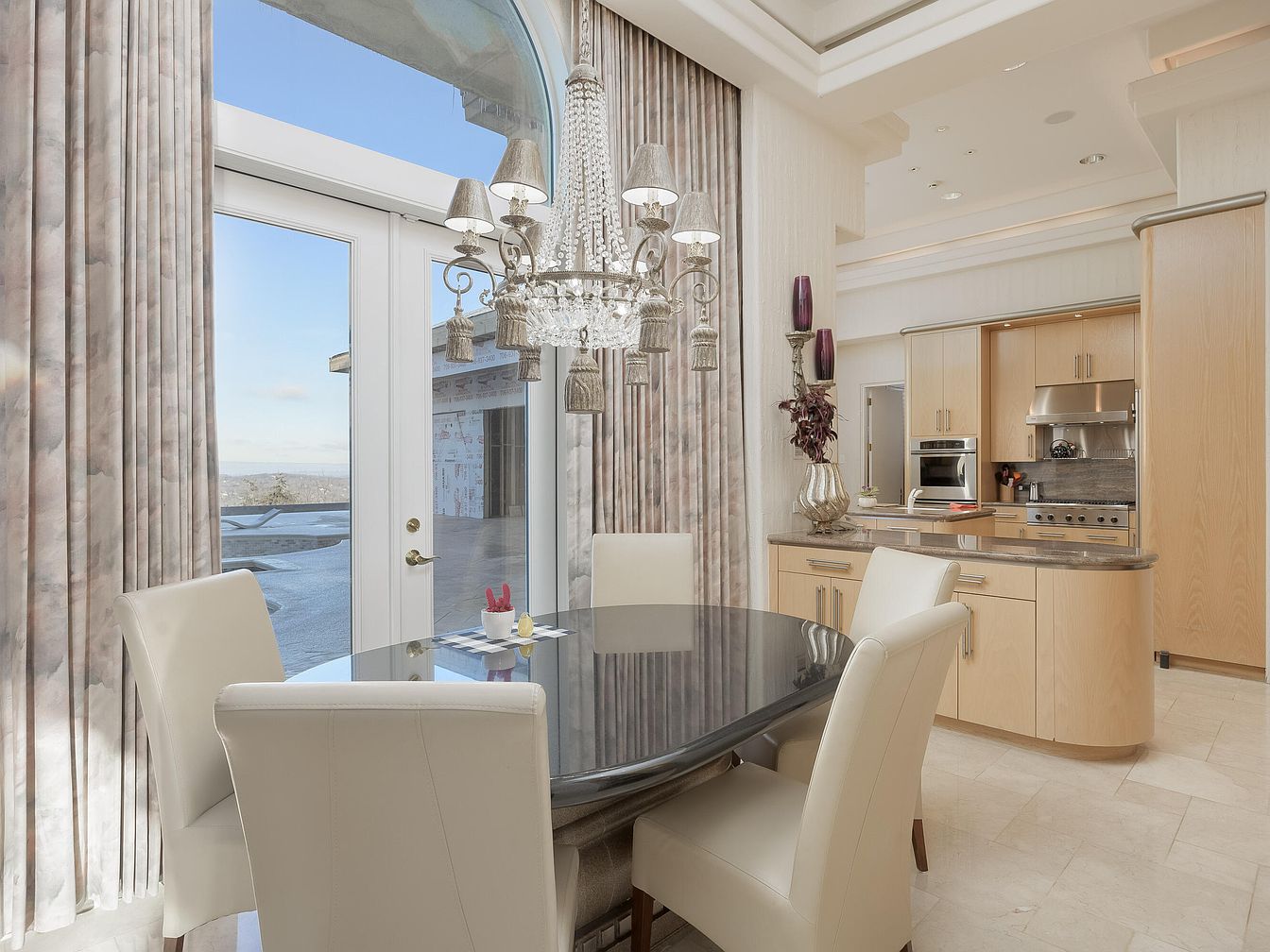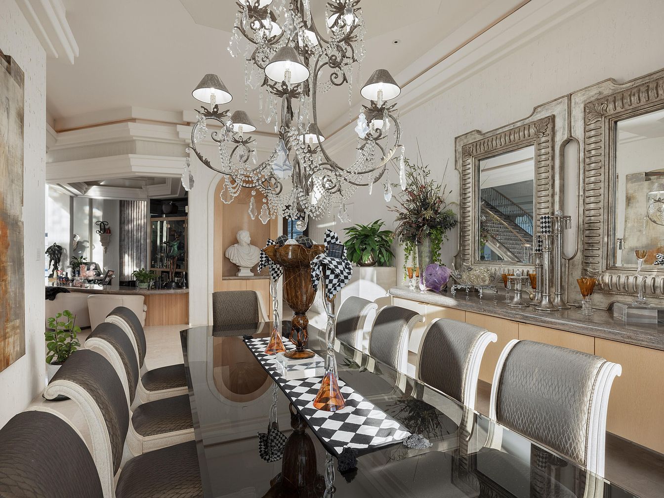 Elegant and spacious, this formal dining room features a long, glass-topped table surrounded by ten upholstered chairs with textured metallic and neutral tones, ideal for large gatherings. The centerpiece is a breathtaking crystal chandelier that adds glamour and classic appeal. Gold-framed mirrors above a built-in credenza enhance the sense of space and reflect natural light. Thoughtfully placed plants and detailed decorative items infuse warmth, making the space inviting for families. The artwork, sculptures, and carefully curated accessories contribute to the sophisticated yet welcoming ambiance, blending modern comfort with timeless luxury for memorable meals and lively conversation.