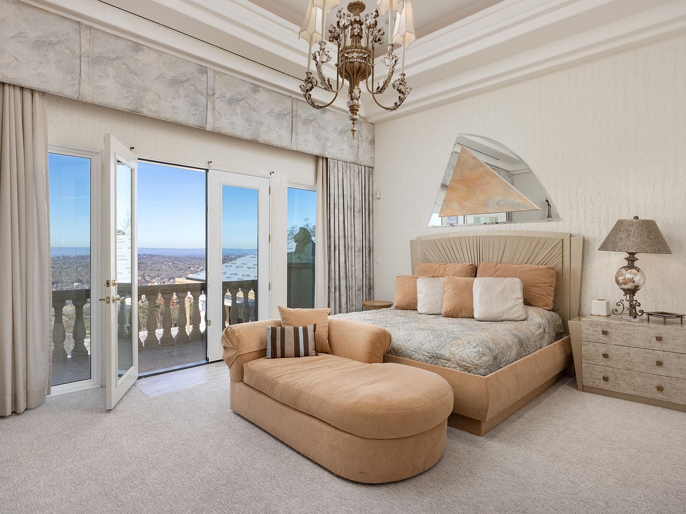 A spacious master bedroom featuring a serene neutral palette, with soft beige and cream tones creating a warm and inviting atmosphere. Expansive French doors open to a private balcony, offering stunning panoramic views that fill the space with natural light. The room is anchored by an elegant bed with geometric detailing, plush cushions, and a stylish chaise lounge for relaxation or family reading time. Architectural crown molding, an ornate chandelier, and a uniquely shaped statement mirror provide sophisticated touches, while the cozy carpeted floor ensures comfort for both adults and children. Ample space and thoughtful design make this room family-friendly and luxurious.