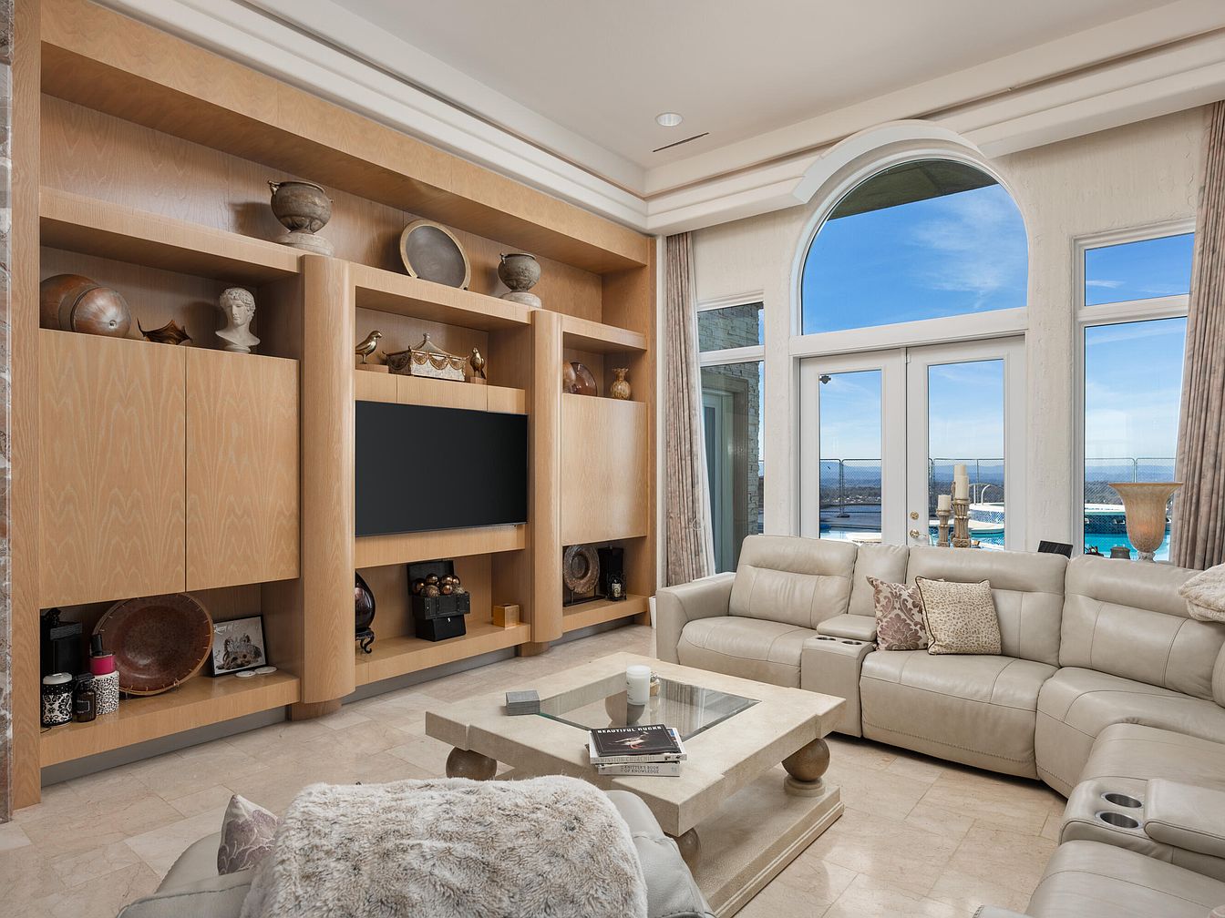 A sophisticated living room showcases a harmonious blend of comfort and style, featuring a spacious sectional sofa in soft beige leather perfect for family gatherings. Large glass doors and tall arched windows flood the room with natural light while offering stunning poolside and panoramic views. The custom-built entertainment center, crafted from light wood, displays curated decorative pieces alongside a sleek television. Neutral tones, stone flooring, and textured throw blankets create an inviting and warm atmosphere. Built-in storage and cup holders enhance functionality, making this space ideal for both entertaining guests and relaxed everyday living.