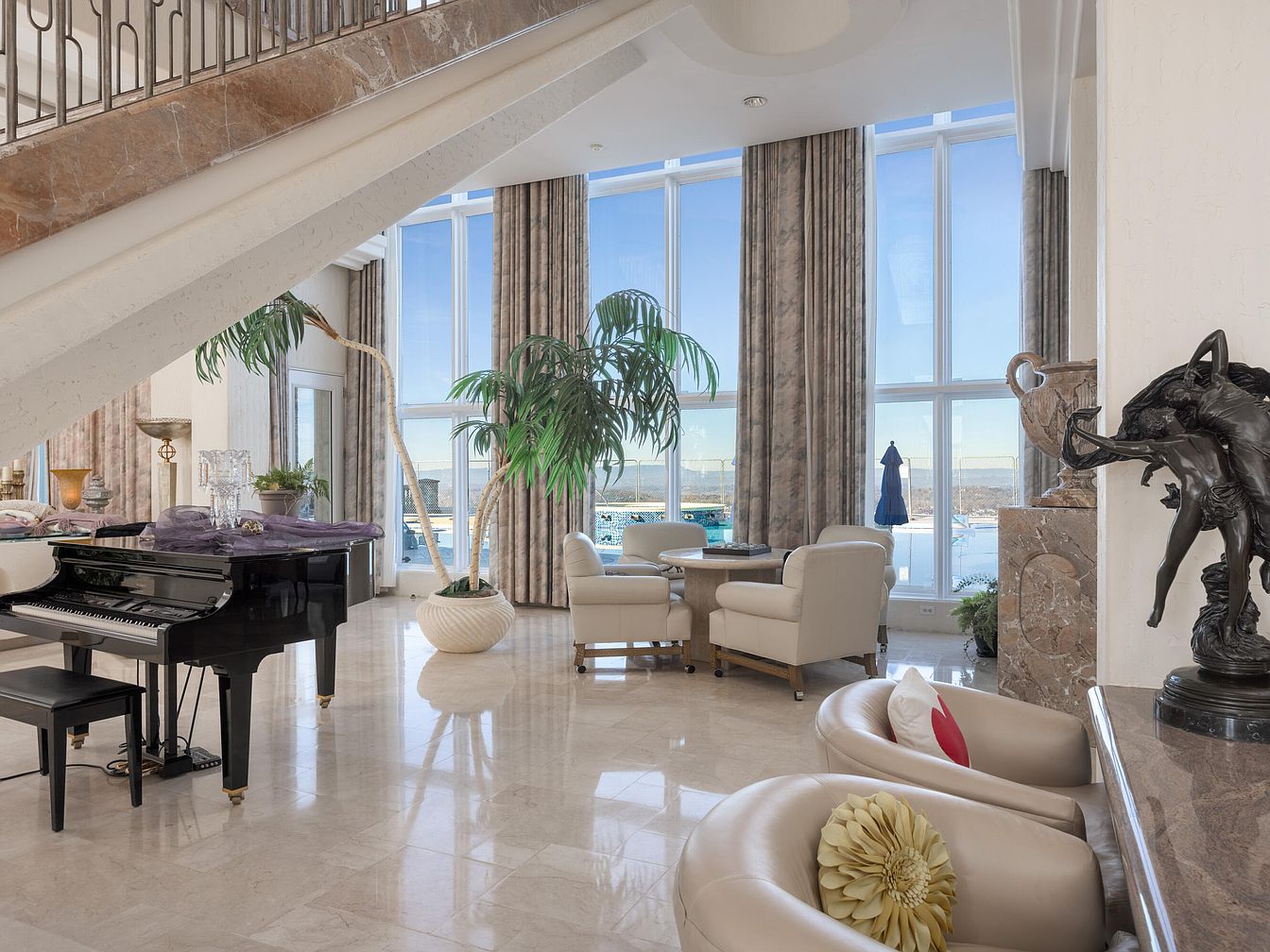 A grand living space with soaring floor-to-ceiling windows that flood the room with natural light, offering panoramic views of the outdoors. Soft beige marble floors complement plush, cream-colored armchairs and curved loungers, providing comfortable seating ideal for family gatherings. A glossy black grand piano adds a touch of sophistication, while tall indoor plants introduce an element of nature. The dramatic stair well features intricate railings and marble accents. Neutral-toned drapery frames the windows, enhancing the airy atmosphere, and elegant sculptures and vases contribute artistic flair, making this a perfect spot for relaxing, entertaining, or enjoying music together.