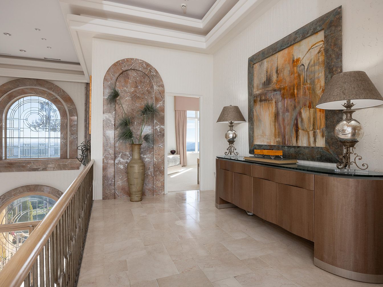 Spacious upstairs hallway featuring polished marble floors and elegant crown molding offers a luxurious, open feel. Natural light pours in through stunning arched windows adorned with decorative glasswork, brightening the neutral palette throughout the space. A modern sideboard with a glass top anchors the hallway, flanked by two contemporary lamps and a large abstract painting that adds a splash of color. The alcove is highlighted with a tall vase filled with greenery, and the railing provides safety and openness. An inviting doorway leads to a comfortable room, emphasizing the hallway’s family-friendly flow and visually connected spaces.