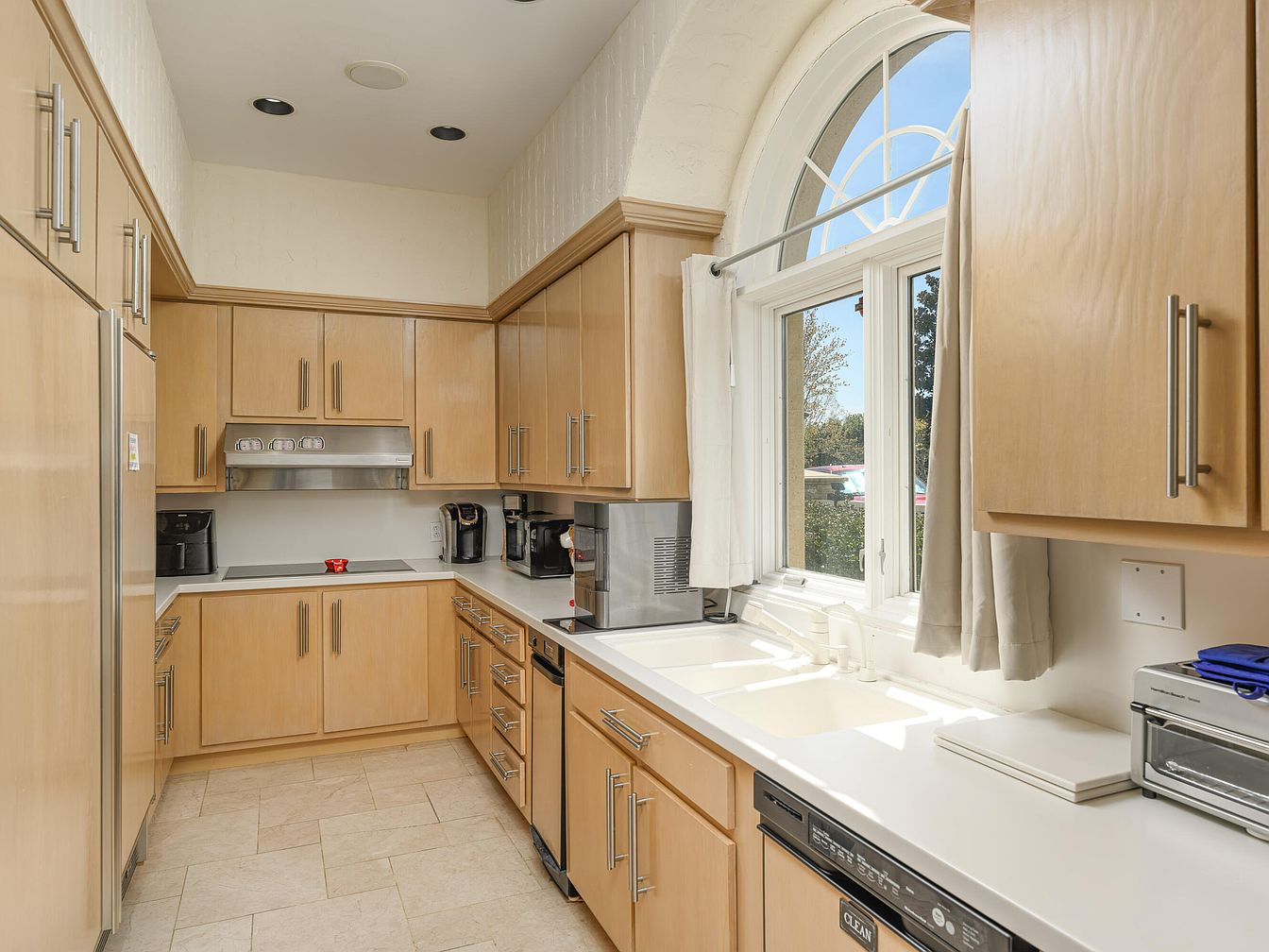 A bright, inviting kitchen featuring light wood cabinetry and sleek, modern hardware creates a warm and friendly atmosphere perfect for family gatherings. Ample countertop space provides plenty of room for meal prep, while multiple appliances and a dishwasher make daily routines convenient and efficient. A large arched window above the sink lets in abundant natural light, framing a scenic outdoor view and giving the kitchen an airy, open feel. Neutral tile flooring and minimalist backsplash complement the cabinetry, creating a cohesive look. The open layout and functional design make this kitchen a practical and aesthetically pleasing hub for the household.