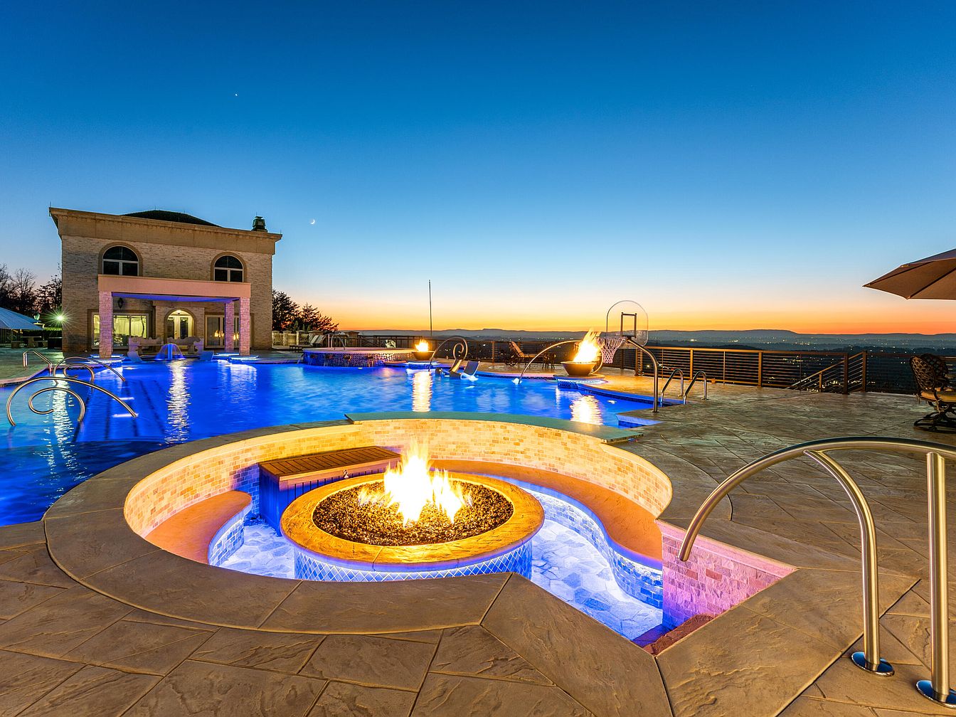 A luxurious backyard showcases a resort-style pool illuminated with soft, vibrant blue lighting, creating an inviting and family-friendly ambiance at dusk. A circular sunken fire pit rests partially in the water, doubling as a cozy lounge with curved stone seating, perfect for intimate gatherings or family evenings. The pool features multiple levels, handrails for easy entry, and a basketball hoop for playful activities. Smooth stone decking and modern stainless steel accents blend with the elegant architecture of the adjacent home, while panoramic views of the sunset and landscape add to the relaxing, inspiring atmosphere, making this space an entertainer’s dream.