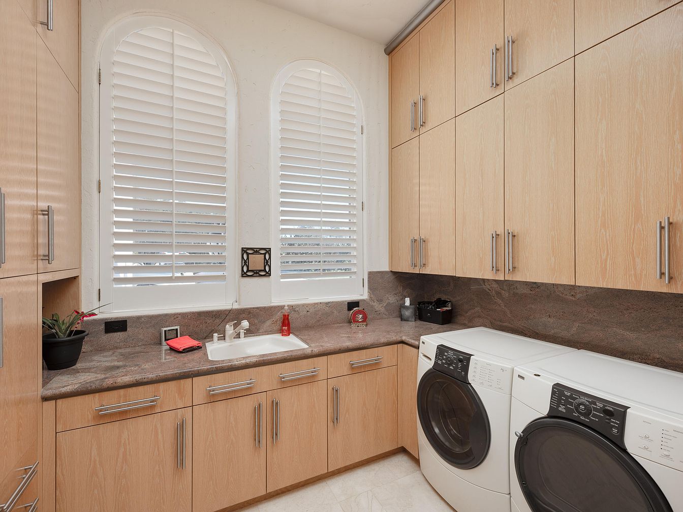A spacious, well-organized laundry room combines functionality and contemporary style, featuring light wood cabinetry that envelops the space with ample storage. The long granite countertop provides a practical workspace next to the built-in sink, ideal for pre-treating clothes or managing household chores. Large front-loading washer and dryer units promise convenience for busy families. Tall, arched windows with plantation shutters fill the room with natural light while ensuring privacy. Accents like modern cabinet handles, minimalist decor, and an indoor plant add warmth and character. A neutral, earthy palette enhances a clean, inviting atmosphere perfectly suited for everyday family life.