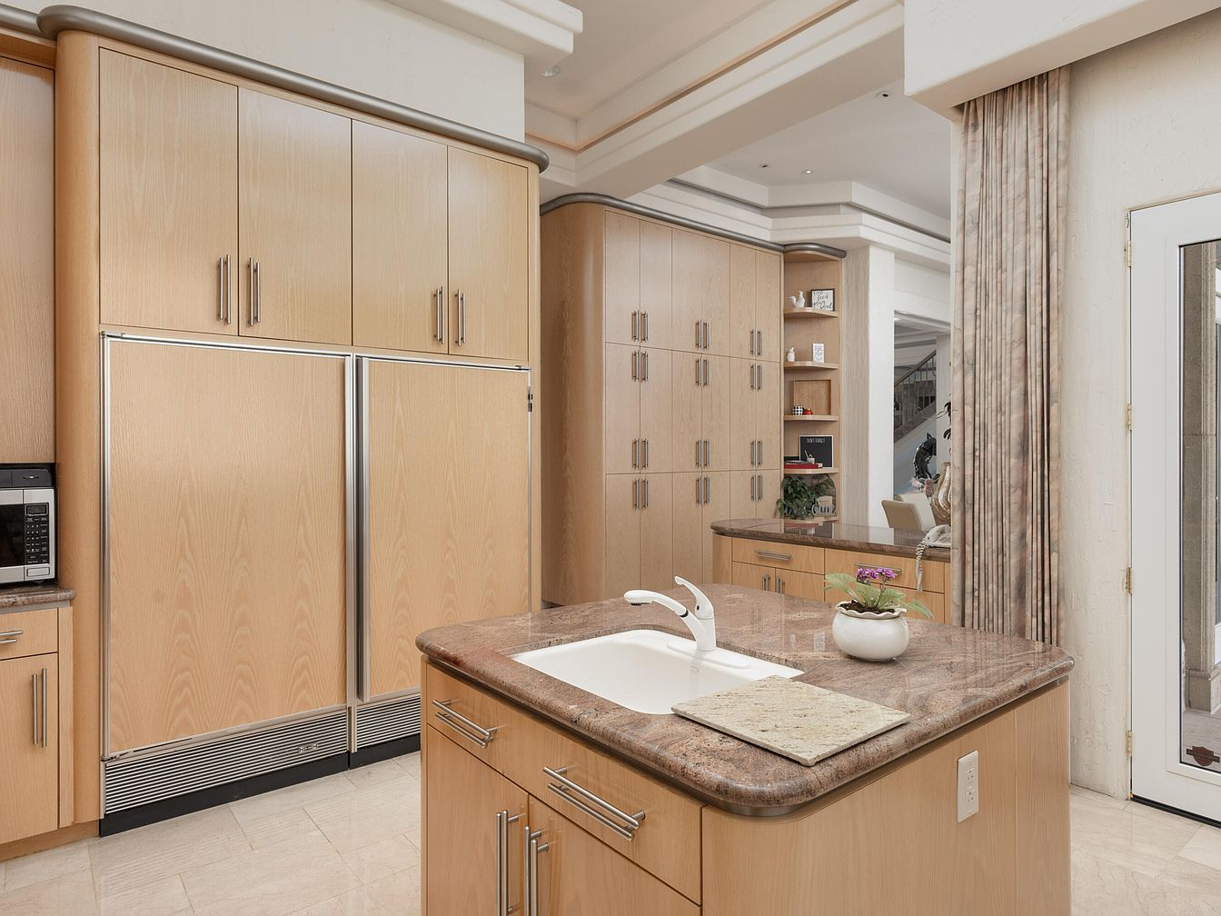 A modern kitchen layout, featuring sleek light wood cabinetry that extends to the ceiling and offers ample storage for a bustling family. The spacious two-door refrigerator blends seamlessly with the cabinetry, while the large marble-topped island in the center offers both a functional sink area and extra workspace. Light neutral tones on the walls and polished stone floors keep the space bright and inviting. Soft curves in the cabinetry and countertop edges add a touch of contemporary elegance. Open shelves and family-friendly seating at the breakfast bar create a welcoming atmosphere for daily meals and gatherings.