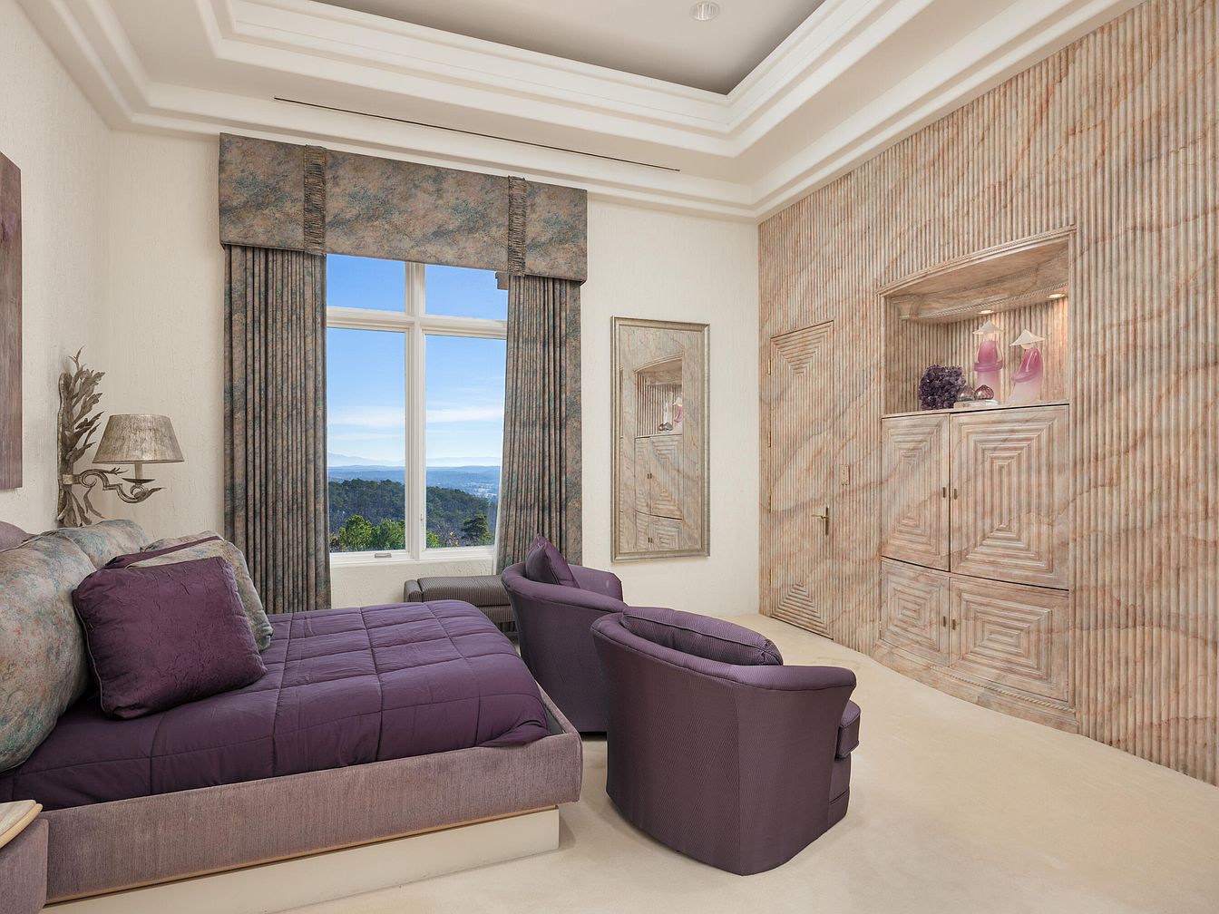 A serene master bedroom highlights a harmonious blend of soft, textured creams and muted lavender accents. A generously sized bed dressed in plush violet bedding and matching pillows is paired with two deep, comfortable armchairs, creating an inviting lounge space ideal for relaxation or family storytelling. Large windows allow ample natural light to illuminate the room while offering breathtaking views of rolling hills. Elegant wall paneling with geometric patterns adds architectural interest, and built-in shelves display curated decorative pieces. Thoughtful touches, such as classic drapes and a mid-century wall lamp, make this room both refined and welcoming for all ages.