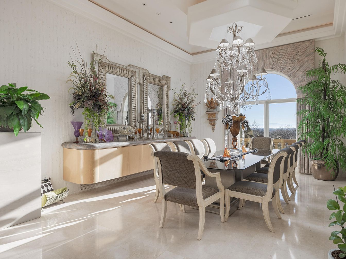This elegant dining room exudes sophistication with a spacious layout that comfortably accommodates a large family or dinner guests. The room is awash in natural light, streaming through a grand arched window that overlooks the landscape outside. A stunning crystal chandelier hangs above a sleek, modern dining table surrounded by upholstered chairs in muted tones. The marble floors and light neutral walls enhance the sense of openness and brightness. Decorative greenery, large ornate mirrors, and floral arrangements add a lush, welcoming touch. The space is both formal yet family-friendly, perfect for gatherings and celebrations.