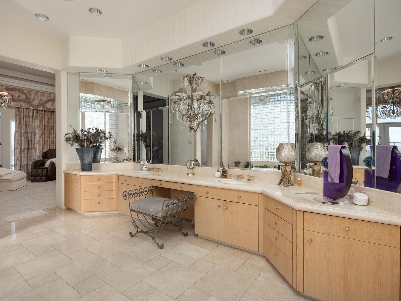 A spacious vanity and dressing area showcases contemporary luxury with wall-to-wall mirrors and light wood cabinetry, creating an open and bright atmosphere. The expansive L-shaped countertop provides ample space for daily routines and personal care, enhanced by elegant details such as gold hardware and display lamps. A cushioned bench with ornate metalwork offers a comfortable and inviting spot for sitting, making the setup both glamorous and functional for family members. Polished stone flooring and neutral-toned walls emphasize a clean, timeless palette, while decorative accents like vases and crystal chandeliers add sophistication and warmth to the space.