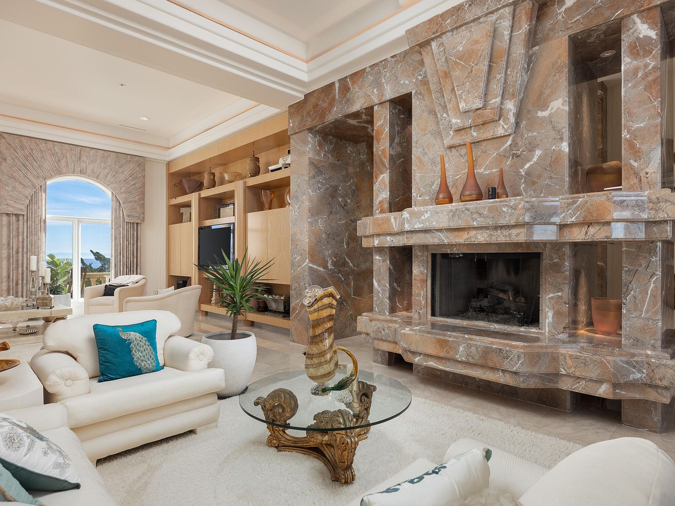A spacious, elegant living room boasting an impressive stone fireplace as the structural and visual focal point. The neutral palette, highlighted by creamy white upholstered furniture and warm beige marble, exudes a welcoming atmosphere. Textured details—such as the intricate fireplace design and arched window treatment—add layers of sophistication. Built-in shelving offers plentiful space for books, décor, or family games, making the room both functional and stylish. Lush green plants and teal accent pillows introduce color and freshness, while plush area rugs ensure comfort underfoot. Wide windows bathe the room in natural light and present views ideal for family gatherings.