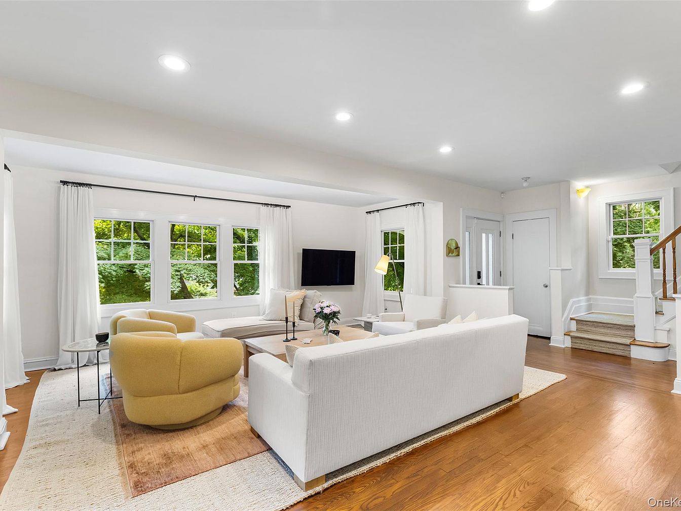 This inviting living room features an open layout ideal for family gatherings and entertaining guests. Large windows draped with soft white curtains allow ample natural light while offering serene views of the outdoors. A plush, cream-colored sofa anchors the seating area, complemented by a pair of modern, mustard-hued armchairs and a light neutral area rug layered over warm hardwood floors. The neutral color scheme enhances the airy ambiance, while gold accents and fresh flowers add warmth and sophistication. The room’s seamless transition to the entryway and adjacent staircase makes it both practical and welcoming for families of any size.