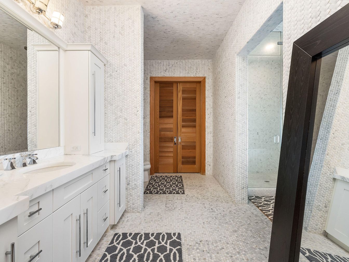 Bright and spacious, this bathroom vanity area boasts a contemporary design with soft, neutral tones that promote a sense of tranquility. The double-sink vanity features white shaker cabinets and sleek hardware, topped with elegant white marble countertops. Subtle mosaic tilework covers the floor and walls, adding sophisticated texture throughout. Warm, natural wood doors provide contrast and a welcoming touch. Family-friendly functionality stems from the roomy layout, easy-to-clean surfaces, and generous counter and storage space. Accent rugs add visual interest and comfort underfoot, while good lighting and a large mirror enhance the practicality for daily routines.