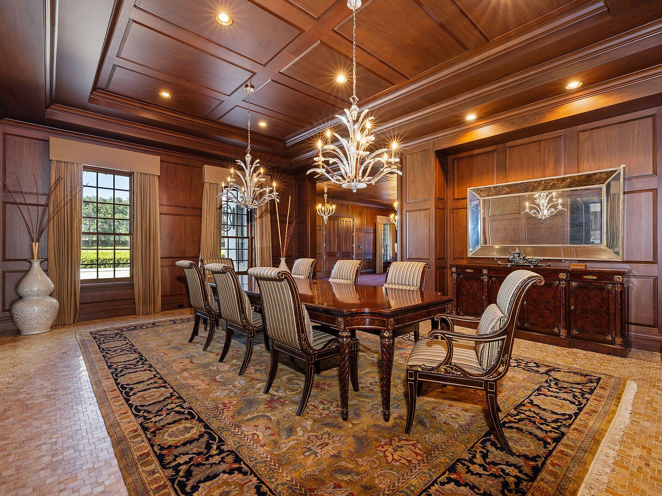 A richly paneled formal dining room designed for elegant family gatherings and entertaining guests. The space features a coffered wood ceiling and wall paneling, creating a warm, inviting ambiance. A large rectangular table with intricately carved chairs comfortably seats eight, while luxurious upholstered seats provide comfort for long meals. Two striking chandeliers add glamour to the traditional design. Tall windows with heavy drapes offer natural light and views of the garden, enhancing the family-friendly appeal. The plush area rug adds warmth and softness underfoot, and a grand sideboard with a large mirror balances the room’s refined, timeless style.