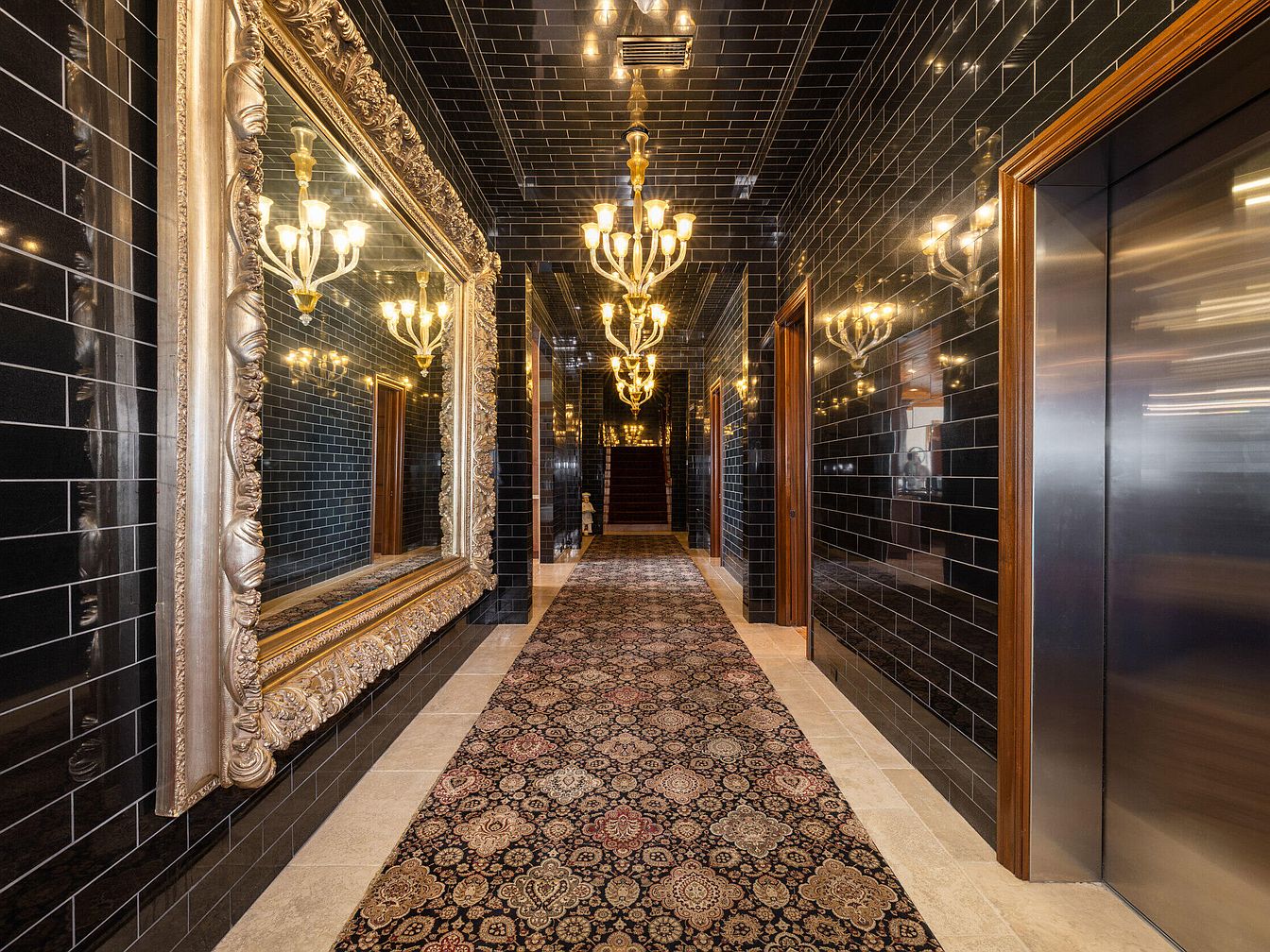 A luxurious hallway delivers dramatic first impressions with its striking black tile walls and ornate golden-framed mirror stretching almost the length of the corridor. Warm-toned chandeliers cast a soft, inviting glow, reflecting off the glossy surfaces and amplifying the grandeur. The floor features an elaborate, traditional runner rug with intricate patterns, providing comfort and elegance underfoot. The space is flanked by wood-trimmed doorways and a sleek elevator, adding both convenience and style. This hallway’s well-lit, family-friendly aesthetic seamlessly combines opulent design with functional living, making it ideal for busy households and gatherings.