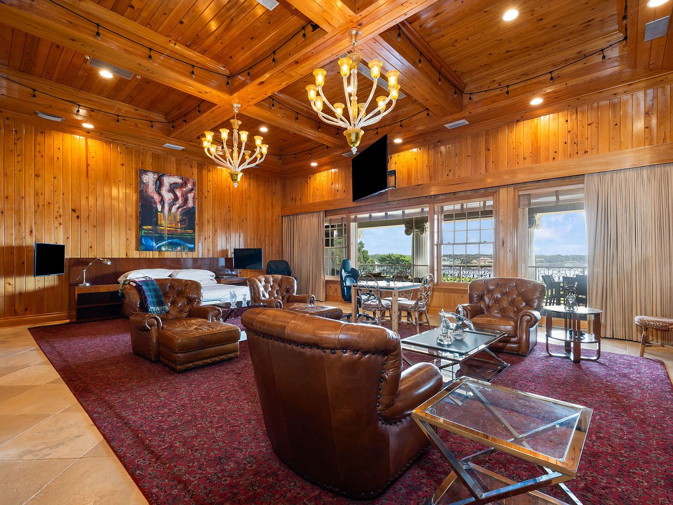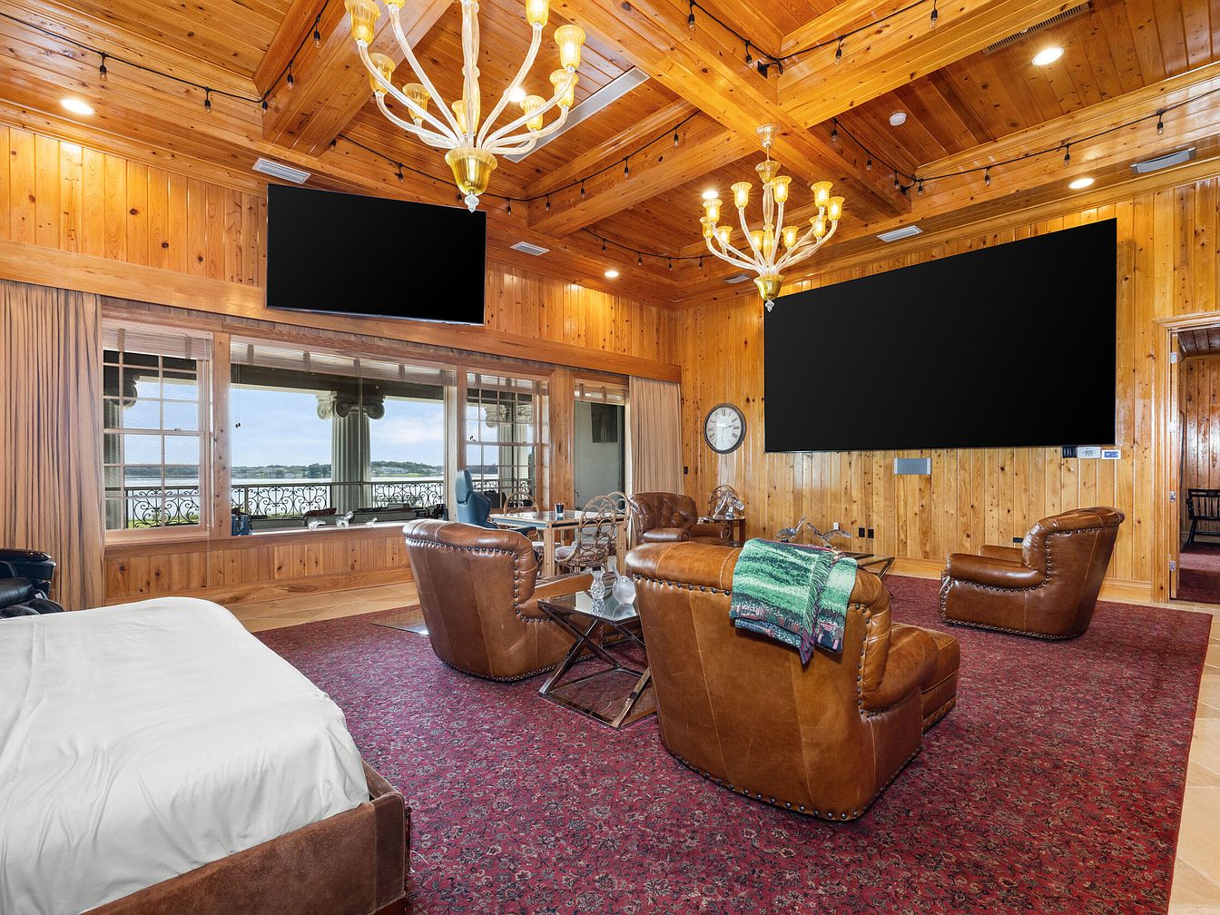 Warm wood paneling and a coffered wooden ceiling bring a rustic elegance to this spacious family room. Large windows stretch across one wall, providing an abundance of natural light and scenic outdoor views, enhancing the welcoming ambiance. Plush leather armchairs are grouped around a central glass coffee table, creating a cozy space for conversation or relaxation. A rich red patterned area rug anchors the seating area and adds a pop of color to the neutral-toned room. Dual modern chandeliers brighten the space, while oversized screens promise family movie nights or casual gatherings. A subtle clock and decorative throws lend a personal, family-friendly touch.
