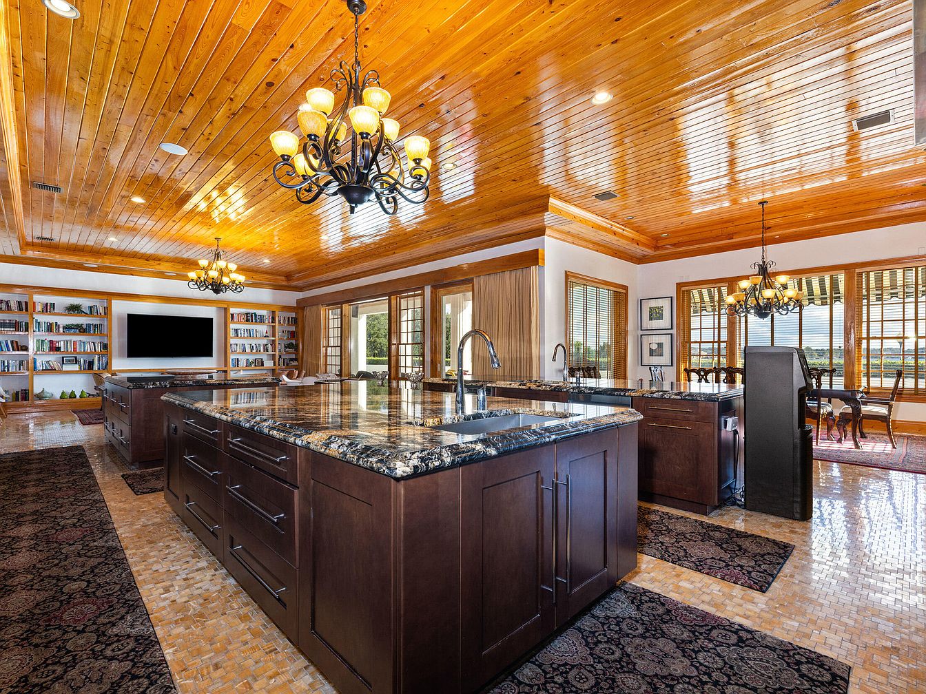 Expansive open-concept kitchen flows seamlessly into a dining area and living space, making it ideal for gatherings and family life. Two substantial kitchen islands with deep granite countertops provide abundant workspace and serve as informal gathering spots. The ceiling and trim feature polished natural wood, lending warmth and a rustic, inviting character. Ornate chandeliers create a touch of elegance, while large windows flood the area with natural light and offer picturesque outdoor views. Built-in shelving with books and entertainment center add homely touches, and the plush area rugs and hardwood tones ensure the space feels cozy and inviting for all ages.