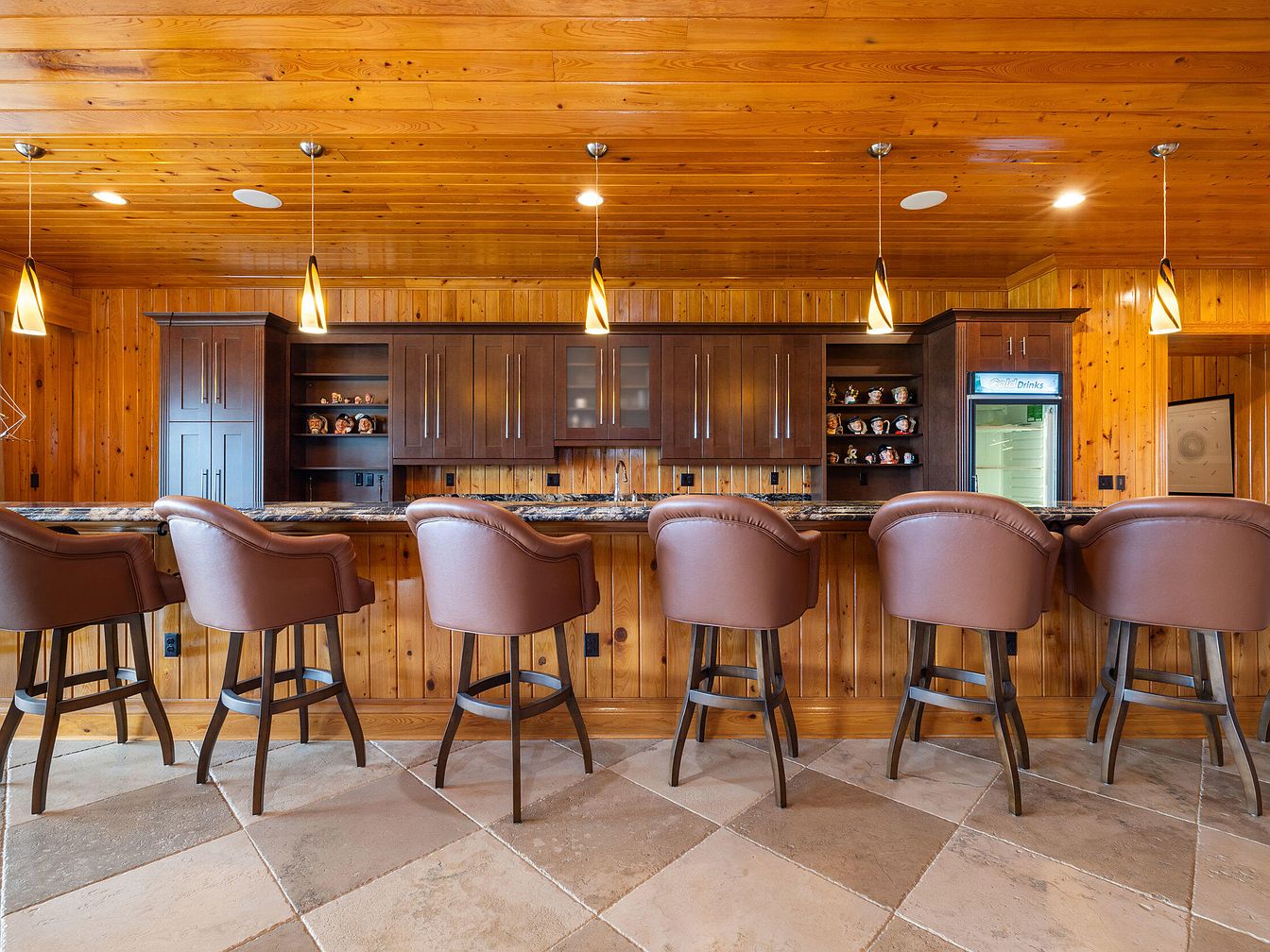Warm wood paneling dominates both the ceiling and walls, creating a cozy and inviting setting perfect for gatherings. A long granite countertop offers ample seating with plush leather bar stools, making it ideal for family conversations or entertaining guests. Pendant lighting adds elegance and a soft glow over the bar, highlighting the sleek cabinetry with its deep, rich finish. The cabinetry includes glass-front doors perfect for displaying glassware, as well as a built-in beverage fridge for easy access to drinks. The spacious tiled floor is durable and family friendly, easy to clean, and suits the overall relaxed yet sophisticated atmosphere.