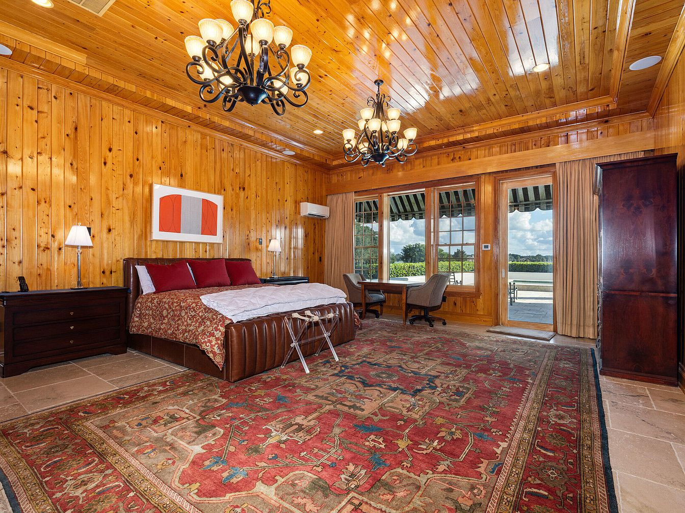 Warm pine paneling and a gleaming wood ceiling create a cozy, cabin-like feel in this spacious master bedroom. A large, richly patterned area rug grounds the room, while the plush bed, dressed in red and gold bedding, is flanked by dark wood nightstands and modern table lamps for added comfort. Family-friendly features include generous natural light from wide windows and a private seating nook perfect for games, reading, or homework. French doors offer easy access to an outdoor patio with serene views, making this space an inviting sanctuary that blends classic elegance with practical family living.