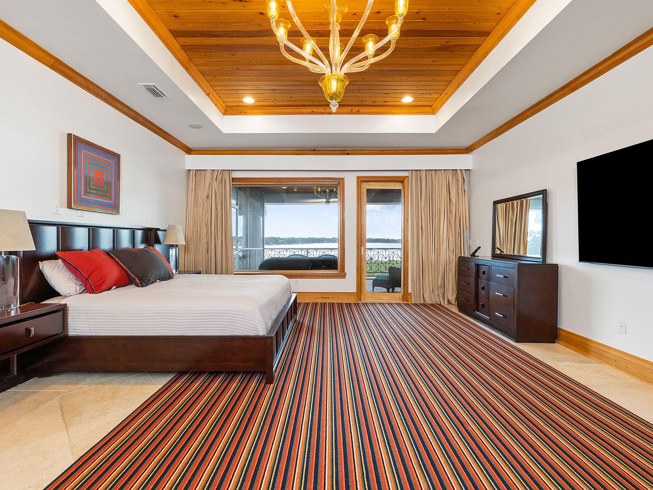 A spacious master bedroom exudes warmth and comfort with its rich wooden trim, tray ceiling, and elegant chandelier as the focal point. The layout provides privacy and relaxation, featuring a generously sized bed with plush pillows in deep red and black tones, complemented by modern lamps and matching dark wood furniture. Large windows and sliding doors open onto a balcony with stunning water views, filling the room with natural light. Soft neutral walls and heavy drapes ensure peaceful nights. The bold, striped carpet adds a playful yet refined touch, creating a family-friendly environment ideal for relaxation and togetherness.