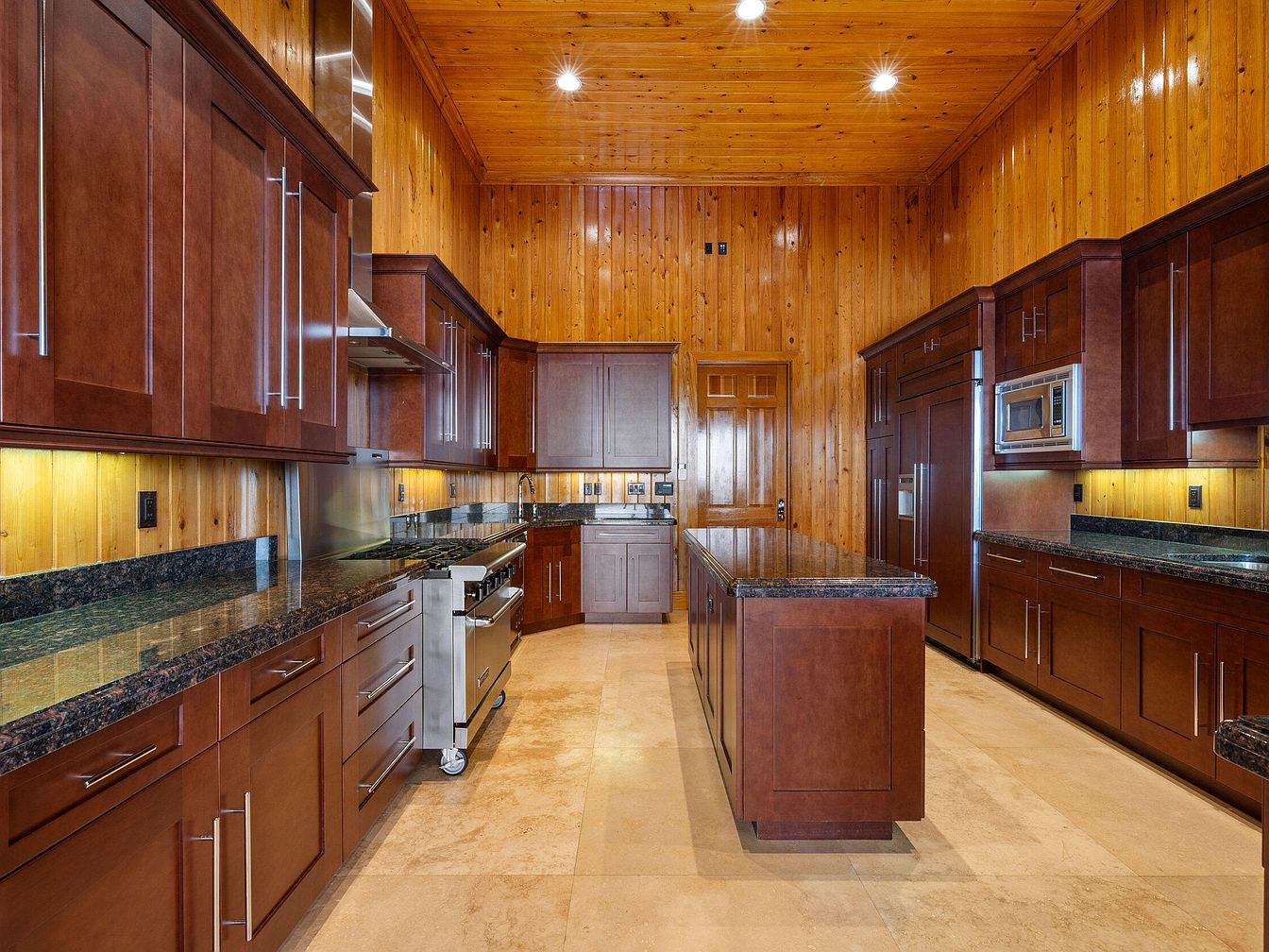 Warm wooden paneling envelops this expansive kitchen, creating a rustic yet sophisticated ambiance that is ideal for family gatherings. Rich espresso-colored cabinetry with sleek metal handles offers abundant storage while dark granite countertops provide both elegance and durability for meal prep. The kitchen is centered around a large island, perfect for casual dining or homework sessions for kids. Stainless steel appliances, including a high-end range and built-in microwave, balance the natural wood tones with a modern touch. Ambient under-cabinet lighting and recessed ceiling lights ensure a bright, welcoming environment that is as practical as it is inviting.