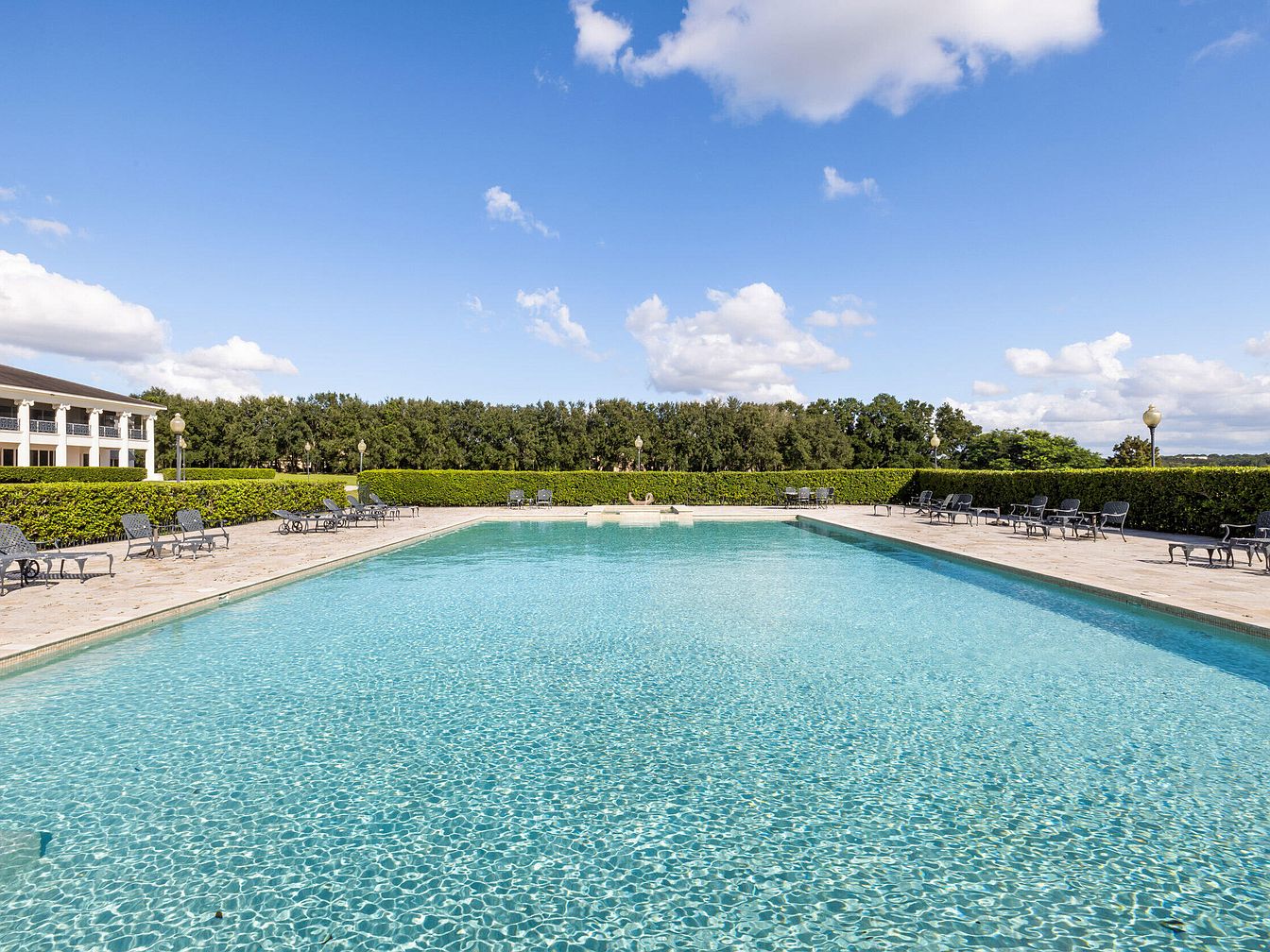 A spacious backyard swimming pool invites relaxation and recreation for families and guests. Surrounded by a wide stone-tiled patio, there are multiple elegant metal lounge chairs perfect for sunbathing or supervising children. The pool’s clear blue water reflects the sky, enhancing the sense of openness and tranquility. Lush manicured hedges surround the pool area, providing privacy, while lush green trees create a peaceful backdrop. The nearby building with its covered balconies adds a touch of classic elegance, ideal for poolside gatherings or outdoor entertaining. This inviting outdoor retreat offers both safety and ample room for activities, making it perfect for all ages.