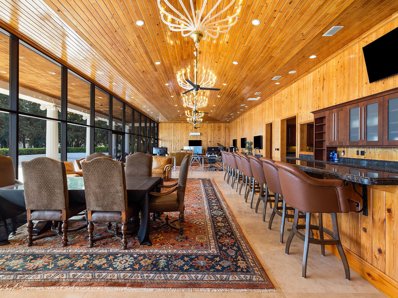This spacious dining and lounge area blends warmth and elegance with its floor-to-ceiling glass walls that flood the room with natural light and offer scenic outdoor views. The wood-paneled ceiling and walls, coupled with soft, recessed lighting and showpiece chandeliers, create a welcoming and sophisticated ambiance. A long bar with leather-backed stools encourages family gatherings, while a large dining table on a richly patterned rug seats many, making the space perfect for shared meals and celebrations. Cabinetry with glass-fronts and multiple television screens add convenience for family entertainment, all within an inviting, refined setting.