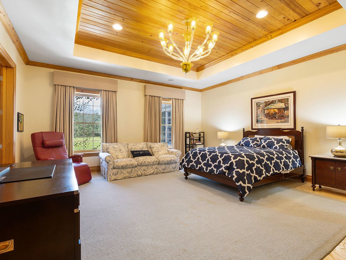 Spacious and inviting, this master bedroom features a blend of rustic charm and modern comfort. A warm wood-paneled tray ceiling with recessed lighting and a striking chandelier sets the tone, while soft beige walls keep the atmosphere serene. Large windows with elegant drapes bathe the room in natural light and provide scenic views, perfect for family relaxation. The king bed, dressed in navy and white geometric linens, is complemented by classic wooden nightstands and tasteful lamps. A cozy floral sofa and plush red recliner create a comfortable seating area, making this room a wonderful retreat for restful nights or quality family time.