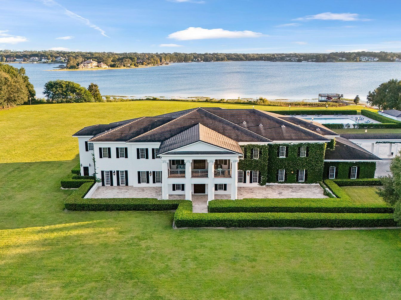 A stately two-story home with a classic, symmetrical design stands prominently on an expansive green lawn overlooking a serene lake. The exterior features white siding paired with black shutters, and the right wing is elegantly draped in lush green ivy. A large columned porch greets you at the entrance, offering a welcoming and family-friendly space to gather. Well-manicured hedges border walkways and accentuate the home’s formal architecture. The generous expanse of grass allows children plenty of room to play safely, while panoramic water views create a picturesque and relaxing setting perfect for family living and entertaining alike.