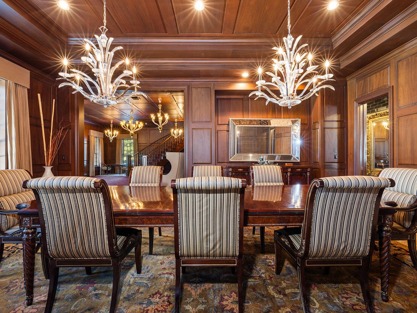 A spacious formal dining area features rich wood paneling on the walls and ceiling, exuding timeless elegance. The grand table comfortably seats eight, ideal for family gatherings or entertaining guests. Plush, striped upholstered chairs offer both sophistication and comfort, complementing the intricate floral-patterned rug underneath. Dual crystal chandeliers cast a warm, inviting light, further enhancing the luxurious atmosphere. Large windows, draped in neutral-toned curtains, provide plenty of natural light, while decorative vases and a statement mirror above the sideboard add finishing touches to the room’s refined yet welcoming design, perfect for family meals and celebrations.