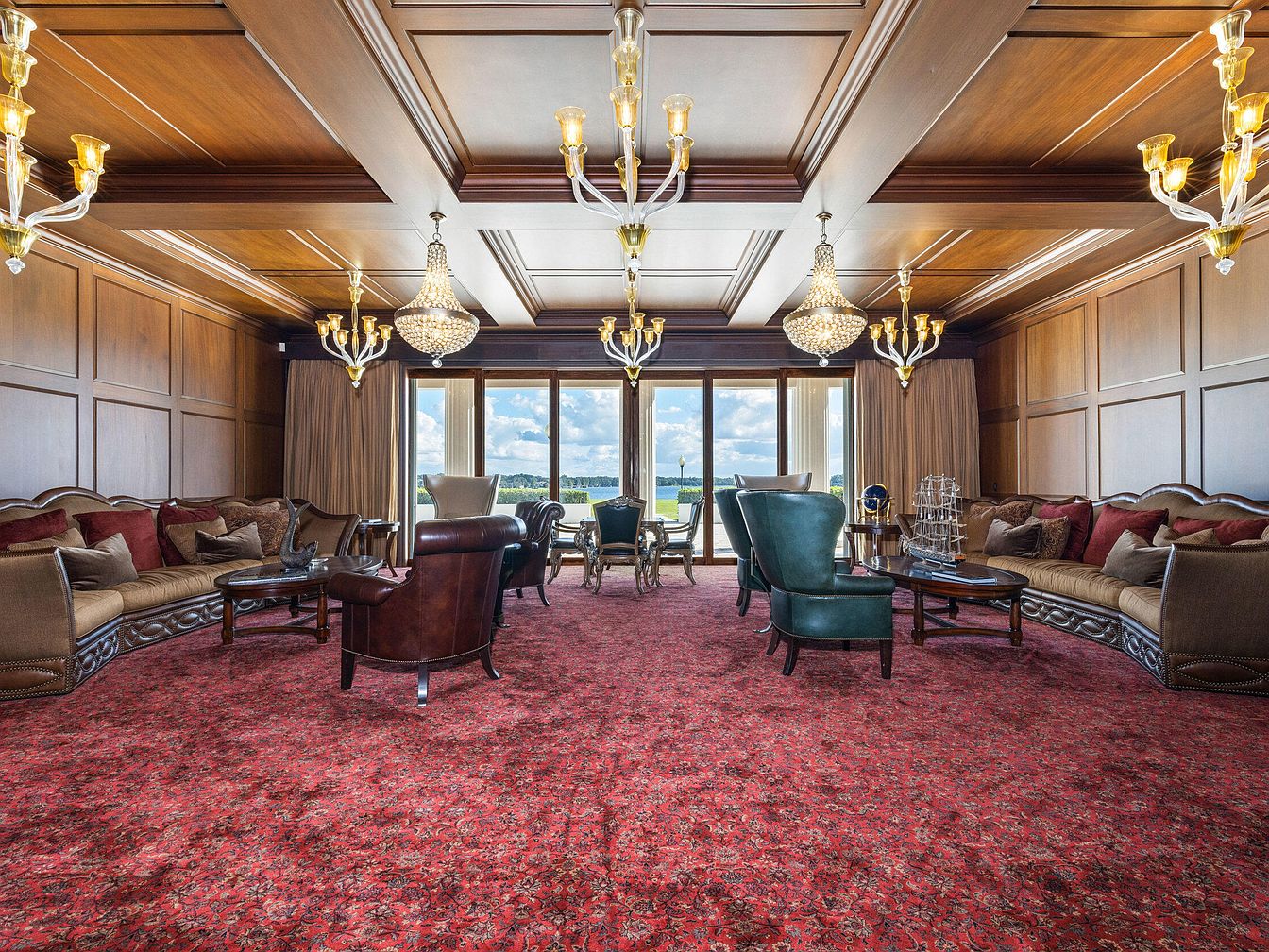 A grand formal living room combines traditional elegance with comfort, perfect for family gatherings or entertaining guests. The space is defined by rich wood paneling and coffered ceilings, creating a sense of warmth and sophistication. Plush sofas in muted gold tones with an array of coordinating throw pillows provide ample seating, complemented by classic armchairs in leather and emerald-green upholstery. A deep red, patterned carpet anchors the room, while sparkling chandeliers and sconces provide an inviting ambiance. Large windows offer scenic views and flood the room with natural light, making it both family-friendly and refined in style.