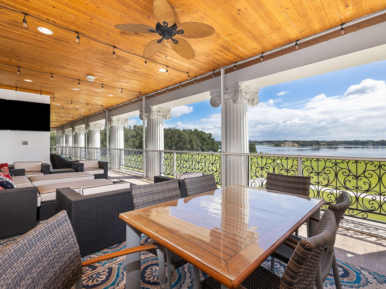 This spacious covered patio blends elegant classical elements with modern comfort, perfect for family gatherings or entertaining guests. Featuring a stunning wood-paneled ceiling with a tropical-inspired fan and string lights, the space maintains a warm, inviting ambiance. Stately white columns with ornate capitals frame sweeping balcony railings, offering unobstructed views of the lush lawn and serene lake beyond. Comfortable woven armchairs and cushioned seating create a relaxed conversation area, while a polished wooden dining table provides a functional spot for meals or game nights. The neutral palette enhances the natural light, making it enjoyable for all ages year-round.