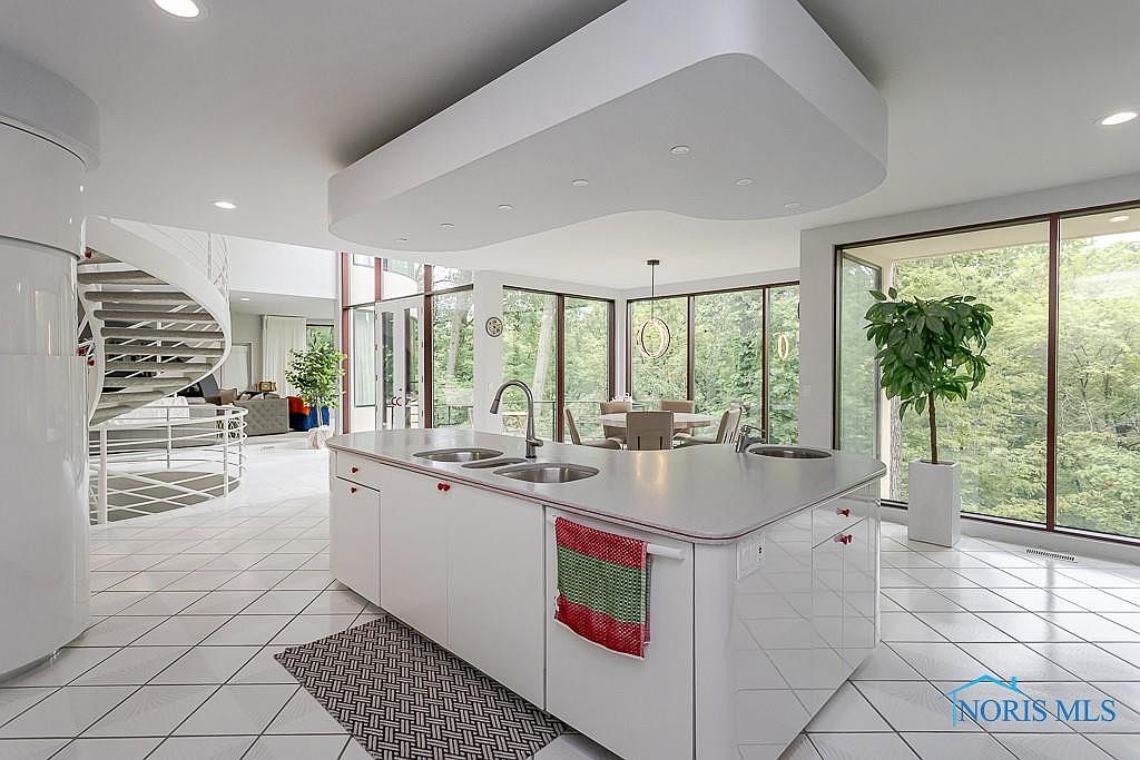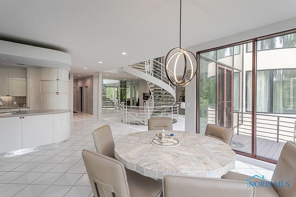 A striking contemporary dining space joins seamlessly with an open kitchen and architecturally dramatic winding staircase. The circular marble dining table is surrounded by plush leather chairs, fostering a cozy yet sophisticated area for family gatherings or mealtimes. Wall-to-wall windows bring abundant natural light and stunning outdoor views, while sleek white cabinetry and curved countertops reflect a clean, modern aesthetic. The open concept layout encourages easy movement between rooms, making it perfect for both entertaining and daily family life. Unique lighting fixtures and glossy tile floors add further elegance, complementing the airy, welcoming feel.