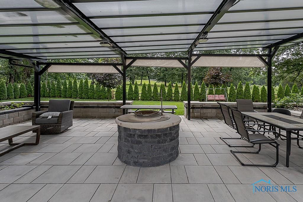 This inviting covered patio features contemporary pavers arranged in a neat, spacious layout, anchored by a large circular stone firepit at the center for cozy family gatherings. Ample seating areas include a modern wicker chair and a long dining table with sleek metal chairs, perfect for outdoor meals. Neutral tones of gray and taupe create a calming, versatile palette, while the sturdy pergola structure overhead provides shade and protection. The patio is bordered by lush, manicured greenery and privacy hedges, creating a safe, private, and family-friendly environment ideal for relaxing or entertaining guests.