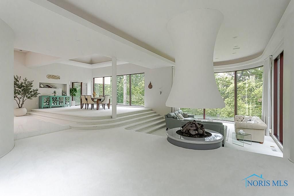 A stunning sunken living area flows gracefully into a raised dining nook, separated by elegant curved steps. Floor-to-ceiling windows bathe the room in natural light and provide peaceful green views, ideal for family gatherings or entertaining guests. The sophisticated, mostly white palette creates a tranquil atmosphere, while plush sectional sofas and a central conversation pit with a modern circular fireplace invite relaxation. Subtle touches of color, like the turquoise buffet and green plants, add warmth and personality. With ample seating and open sightlines, this space balances contemporary design with family-friendly comfort and functionality.