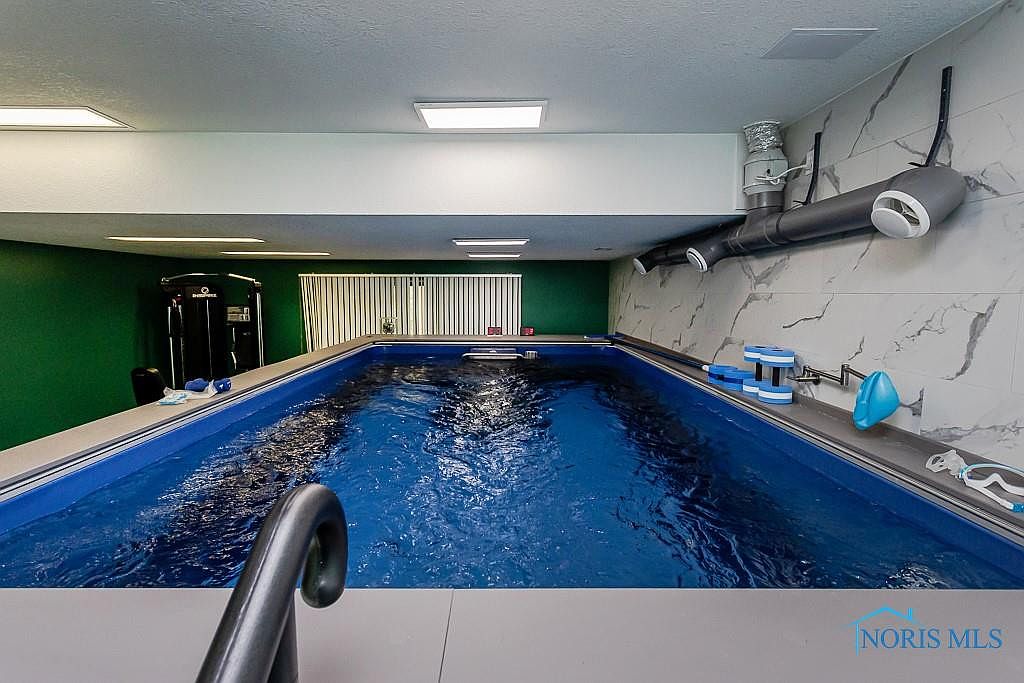 A stunning indoor pool room offers year-round aquatic enjoyment, perfect for families to swim and relax in privacy and comfort. The sleek blue pool is surrounded by clean, modern lines and a warm green accent wall, creating a calming atmosphere. Large, white marble-patterned tiles line one wall, accented by silver fixtures and pool accessories, reflecting sophisticated taste. Overhead recessed lighting ensures a bright space day or night, and vertical blinds over the window provide privacy and light control. The adjacent fitness equipment highlights the family-oriented, health-conscious design, making this space ideal for both exercise and leisure.