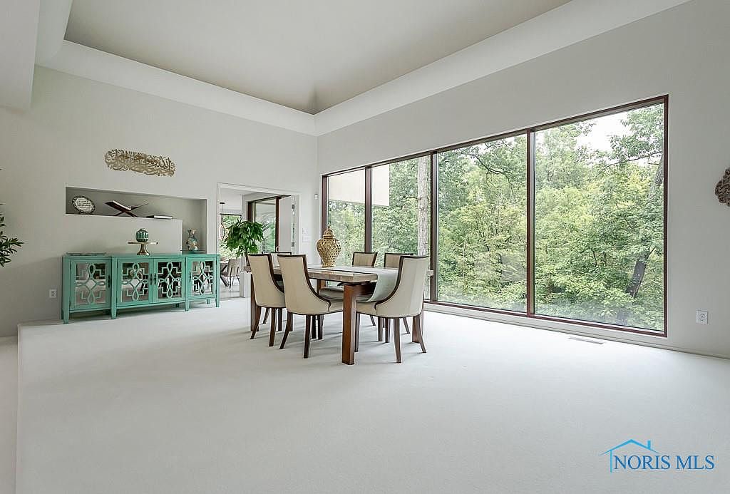 This open, airy dining area features a stunning wall of floor-to-ceiling windows that offers serene forest views and floods the space with natural light. The soft, neutral color palette—primarily white walls and plush carpeting—amplifies the room’s brightness and sense of tranquility. A sleek wooden dining table with eight upholstered cream chairs invites family gatherings and entertaining. Accentuating the space, a turquoise credenza adds a pop of color and visual interest, while built-in shelving displays decorative accents. The overall layout is open and family-friendly, with plenty of space for children to move comfortably and large windows offering a calming connection to nature.