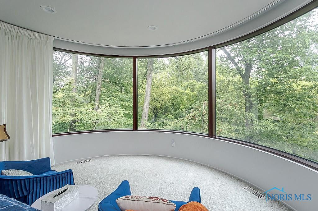 Curved floor-to-ceiling windows provide a stunning panoramic view of the surrounding green woods, filling this sitting area with natural light and offering a serene, retreat-like atmosphere. Plush, family-friendly blue armchairs add a pop of color and comfort, making it an inviting space for reading or relaxing together. The space features soft, neutral carpeting and flowing white drapery for a tranquil, airy feel. Architectural details like the sweeping window wall maximize both privacy and immersion in nature, creating a calming oasis that brings the outdoors in, perfect for quiet moments or sharing conversation with loved ones.