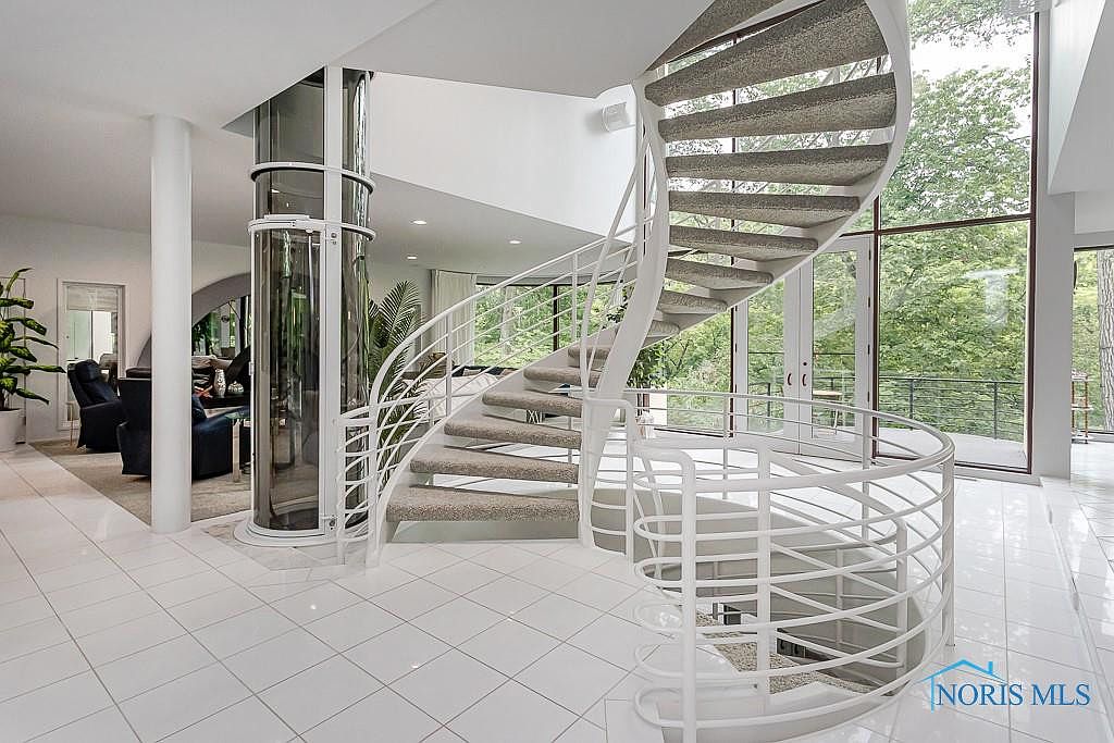 A striking spiral staircase anchors this modern foyer, merging elegance with functionality. Floor-to-ceiling windows bathe the area in natural light and frame lush woodland views, while glossy white tile flooring amplifies brightness and openness. A sleek in-home elevator beside the staircase offers accessibility for all family members, blending seamlessly with the minimalistic, contemporary design. Soft grey carpeting lines the stairs, and a sculpted white railing adds an artistic touch. The open-concept layout flows into a comfortable living space with plush seating, large potted plants, and abundant lounge areas, making it ideal for entertaining and family gatherings.