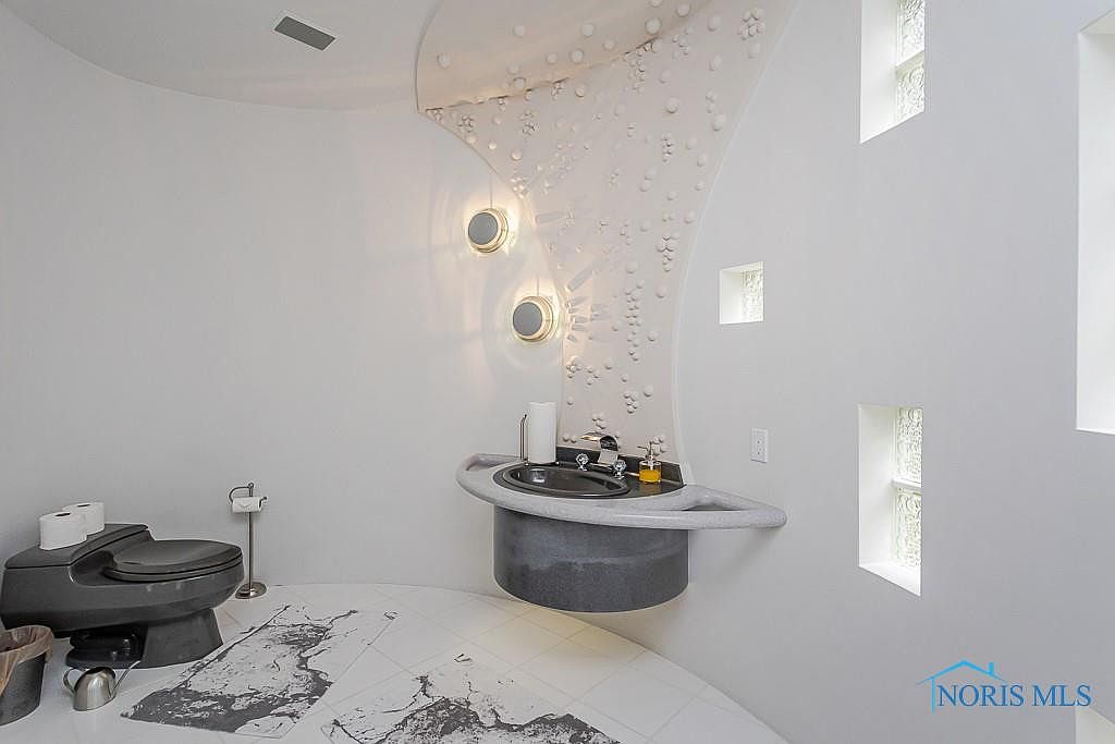 A strikingly modern and artistic bathroom featuring a curved wall accentuated by textured panels and built-in round lighting fixtures. The floating vanity combines sleek lines with a sculptural basin, offering a minimalist yet functional touch perfect for family use. Large charcoal-gray fixtures, including the unique toilet, lend a bold contrast to the crisp white palette. Decorative marble-look tiles on the floor introduce subtle visual interest while remaining easy to clean. Block-style glass windows allow abundant natural light, adding warmth and privacy. The creative, futuristic aesthetics and accessible layout make this space welcoming and adaptable for all ages.
