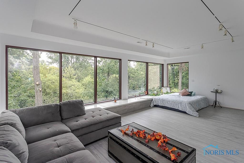 Expansive floor-to-ceiling windows invite panoramic woodland views into this airy bedroom, blending nature with modern living. The space features a light color palette, with pale grey flooring and crisp white walls that enhance brightness and openness. A cozy sectional sofa offers ample seating for family gatherings or relaxation, while the low-profile bed is perfectly positioned to take in the serene landscape. Soft textiles, minimal decor, and versatile furniture choices create a welcoming, family-friendly environment. The thoughtful layout ensures both comfort and functionality, making it ideal for quiet mornings, playtime, or simply unwinding amidst tranquil, picturesque surroundings.
