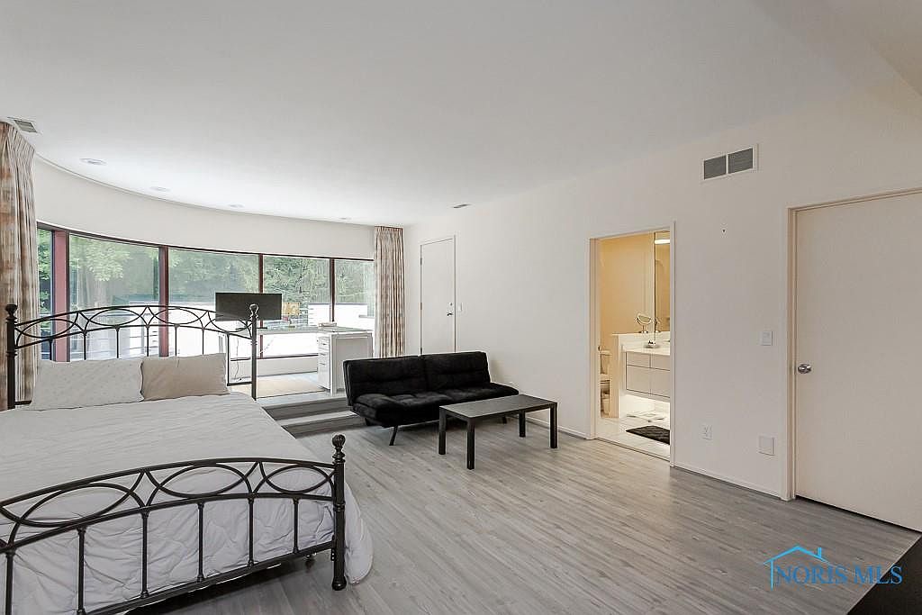 Spacious and inviting, the primary bedroom suite features a serene palette of light gray flooring and soft, off-white walls that enhance the natural light streaming in through expansive curved windows. The room’s open layout comfortably accommodates a wrought iron bed, a plush sofa, and a modern black coffee table, making it an ideal spot for both relaxation and quiet family time. The suite includes private access to a sleek, en-suite bathroom with contemporary fixtures. Floor-to-ceiling curtains frame verdant outdoor views, adding a warm, family-friendly touch and offering privacy while still keeping the environment bright and airy.