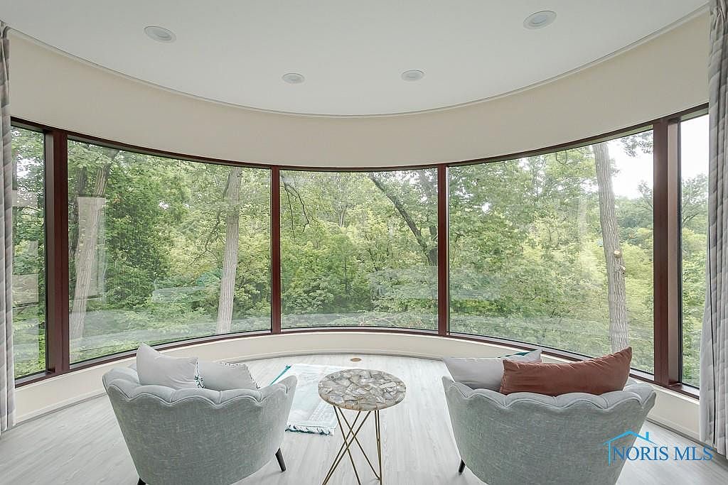 This inviting nook features dramatic floor-to-ceiling curved windows, delivering breathtaking panoramic views of lush woodlands. Two plush, scalloped armchairs are positioned for optimal enjoyment of the scenery and conversation, separated by a small, elegant marble-topped table. Pale wood flooring and neutral wall tones amplify the natural light that floods the space, elevating the serene, airy ambiance. Subtle modern accents, such as recessed lighting and streamlined window trim, blend beautifully with the tranquil, nature-inspired setting. The open layout and cushioned seating make this corner ideal for family reading time, quiet relaxation, or enjoying a morning coffee together.