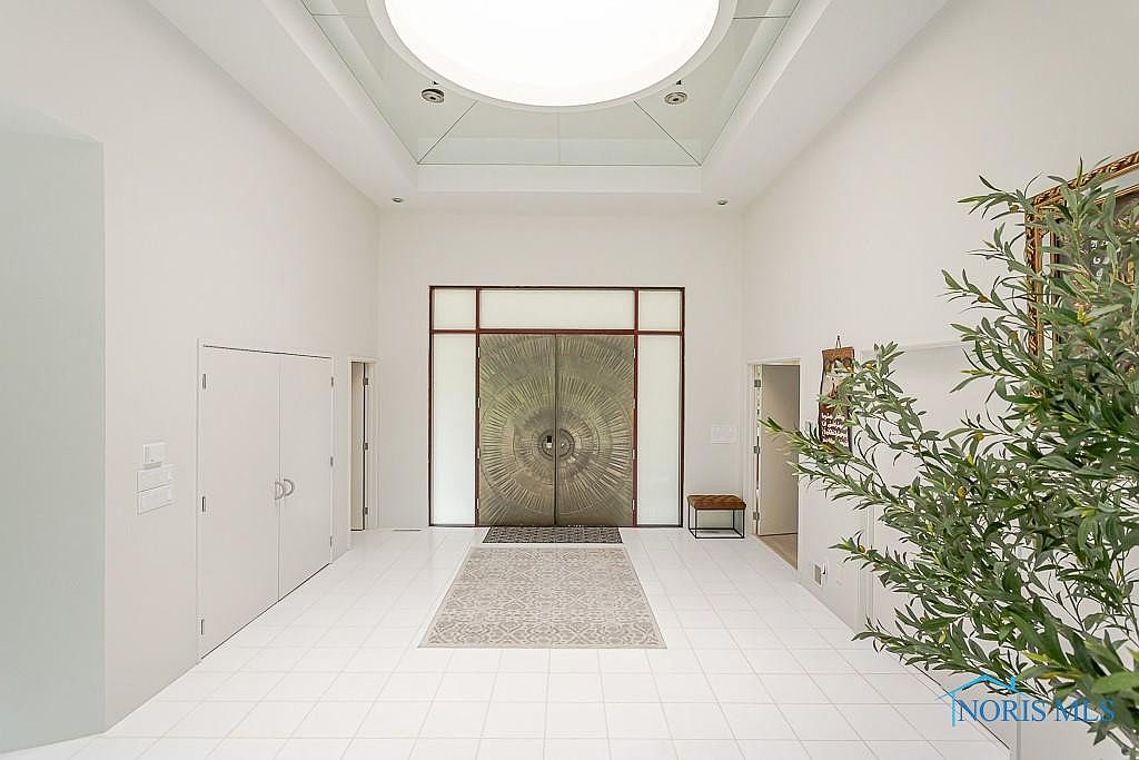 A grand and inviting entryway welcomes guests with high ceilings and an abundance of natural light from a large circular skylight. An intricate pair of double doors with sunburst design detail serves as a stunning focal point, framed by frosted glass panels that offer privacy while enhancing the modern aesthetic. The crisp white tiled floor and soft, neutral wall tones create a spacious, airy feel. Functional storage closets line one wall, perfect for family organization, while a small bench provides a comfortable spot for removing shoes. Potted greenery and tasteful décor add warmth and a touch of nature, making the space both practical and stylish.