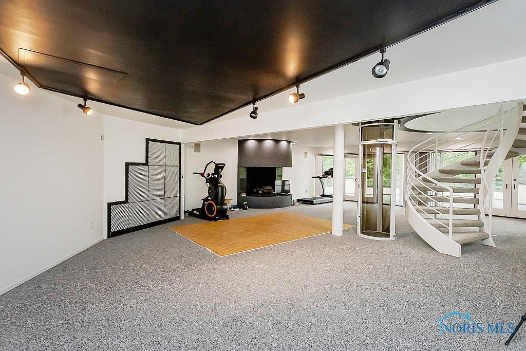 A spacious modern basement designed with family functionality and relaxation in mind, featuring a soft gray carpet that creates a cozy foundation throughout. The open layout allows for multiple uses, from recreation to exercise, with specialized areas for equipment. A bold, black accent ceiling contrasts with the crisp white walls, bringing a touch of contemporary flair. Sleek, linear track lighting highlights the architectural interest, including a floating spiral staircase and a glass-enclosed cylindrical elevator—perfect for accessibility. Expansive windows and doors invite natural light, while the minimalist decor ensures versatility for gatherings, children’s play, or quiet downtime, making it ideal for active family life.