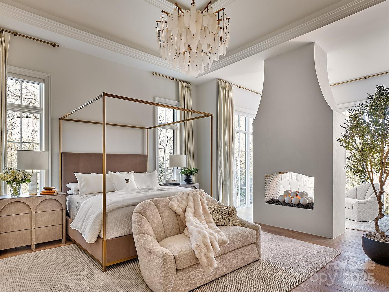 Sophisticated yet welcoming, this primary bedroom features a stunning four-poster bed with a plush upholstered headboard, flanked by chic nightstands adorned with fresh florals. Soaring ceilings and tall windows invite ample natural light, highlighting the calming palette of warm taupe, ivory, and gold. A modern chandelier anchors the space with elegance, while a unique architectural fireplace adds both style and coziness for family evenings or private relaxation. A curved, upholstered loveseat provides a cozy spot for reading or cuddling with little ones, making this room both elegant and family-friendly. The seamless blend of textures and thoughtful layout ensure comfort and serenity.