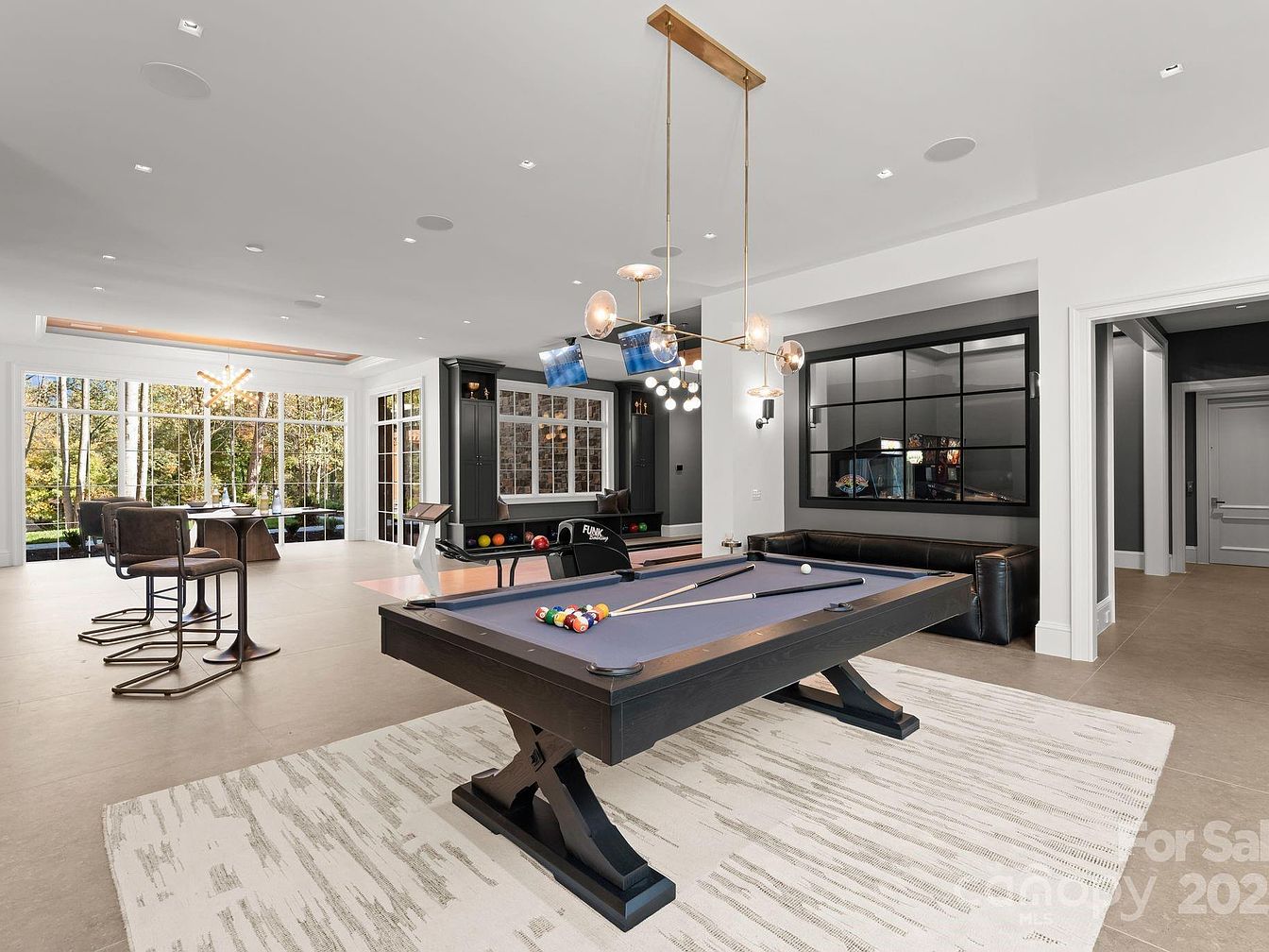 This spacious game room features a modern pool table as its centerpiece, enhanced by a striking contemporary light fixture above. Large floor-to-ceiling windows allow natural light to bathe the open layout, creating an inviting atmosphere for gatherings and family fun. A sleek black leather sectional offers comfortable seating beside the table, while a cozy bar area with high stools invites casual conversation or a snack break. The room showcases a neutral color palette with light tile flooring, white walls, and tasteful black accents. Stylish architectural details, including bold window frames and built-in cabinetry, complete this family-friendly entertainment space.