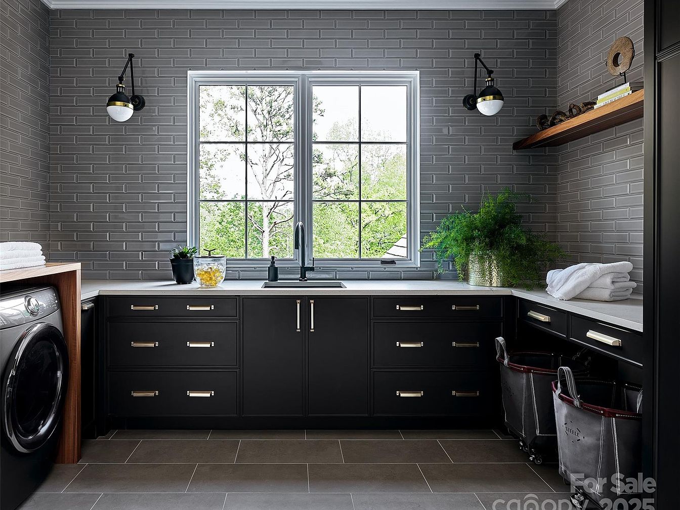 This modern laundry room features sleek black cabinetry with polished chrome handles, offering abundant storage for household needs. A large window above the deep sink bathes the space in natural light, making it bright and inviting. The brick-style grey tile walls add an urban yet cozy touch, while wall sconces provide extra illumination. Functional elements like a front-loading washer, spacious countertops for folding, open shelves, and rolling laundry baskets enhance practicality for families. Pops of greenery and neatly stacked towels create a welcoming vibe, while the neutral palette blends effortlessly with the clean lines and contemporary design aesthetic.