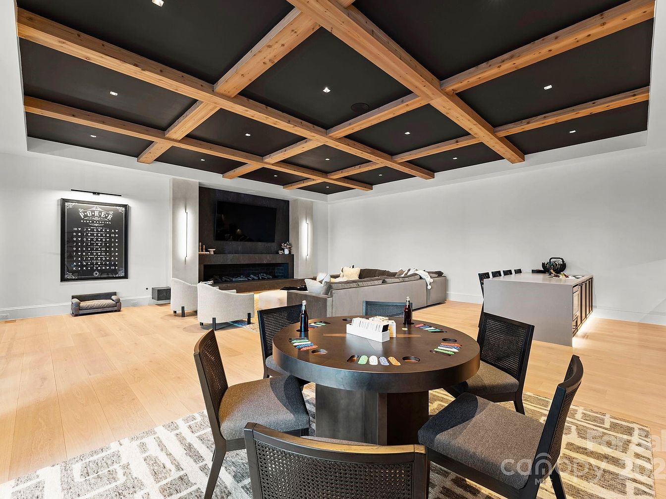 An open-concept entertainment room seamlessly blends a cozy lounge area, a poker table, and a sleek bar, providing ample space for family gatherings or social entertaining. Light natural wood floors contrast beautifully with a striking coffered ceiling featuring exposed beams and recessed lighting, adding modern character and warmth. Soft gray and beige tones dominate the space, with plush sectionals and cushioned chairs inviting comfortable relaxation. The built-in fireplace beneath a large wall-mounted TV anchors the room, while the poker table area sits atop a geometric rug for added texture. The bar features minimalist cabinetry and modern finishes, perfect for snacks and drinks.
