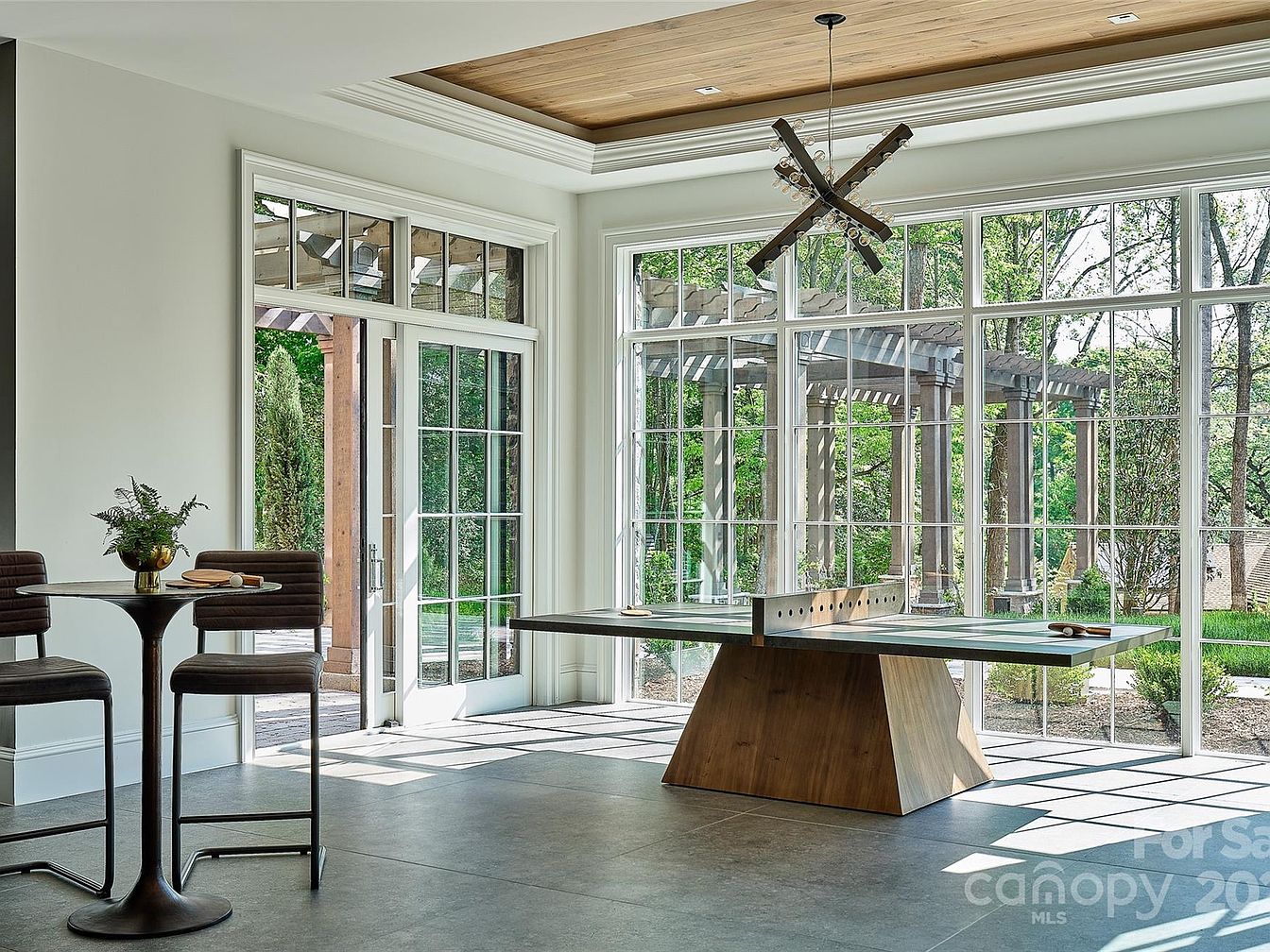 This light-filled sunroom offers the perfect blend of relaxation and entertainment, featuring expansive floor-to-ceiling windows that frame views of the lush garden and outdoor pergola. The airy layout centers around a modern wooden ping pong table, inviting family members of all ages to gather for game nights. Neutral walls and large stone-look tile floors are complemented by the soft natural light, while the wood-accented ceiling adds architectural interest. A cozy bistro table set allows for casual snacking or supervising little ones at play. The seamless indoor-outdoor connection and open design make this space ideal for family activities.