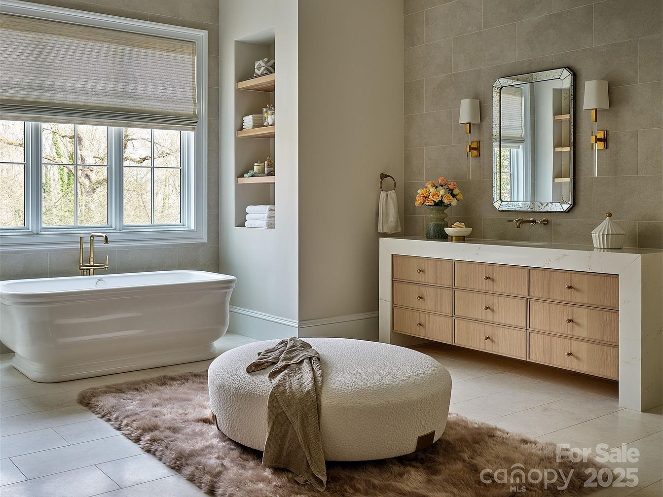This spacious bathroom exudes modern luxury with calming, neutral tones throughout. A freestanding soaking tub sits beneath a large window, inviting natural light and providing tranquil views. Soft beige tiles line the floor and accent walls, while a sleek double-sink vanity in light wood is framed with white marble, topped with fresh flowers for a welcoming touch. Built-in open shelving keeps towels and essentials within easy reach, enhancing convenience for families. A plush, circular ottoman rests on a cozy faux fur rug at the center, creating a relaxing spot for lounging and adding warmth to the sophisticated atmosphere.